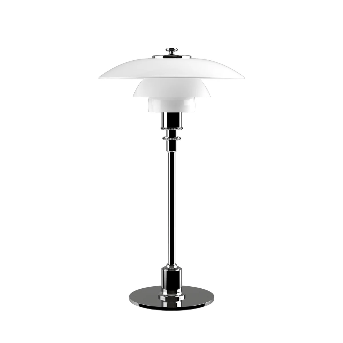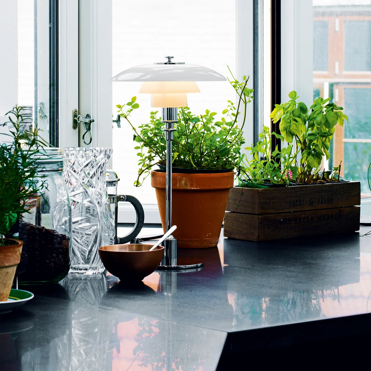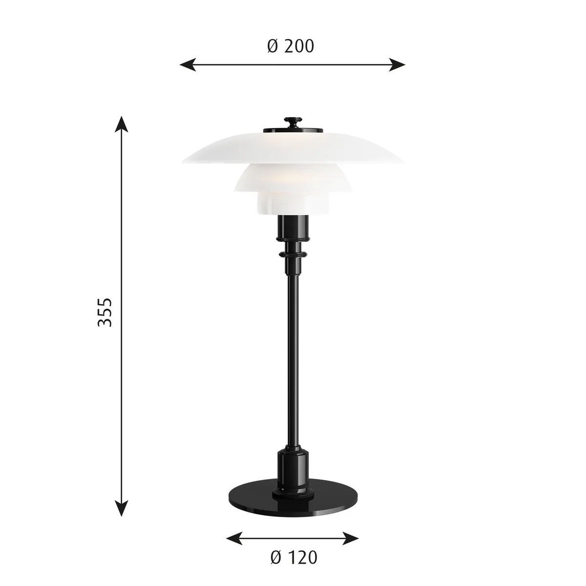La petite lampe de table PH 2/1 a été conçue sur le principe d'un système réfléchissant à trois abat-jour qui dirige la majeure partie de la lumière vers le bas. Les trois abat-jour sont fabriqués par Louis Poulsen en verre soufflé à la bouche et opalisé à trois couches. Les abat-jour sont brillants à l'intérieur et sablés à l'extérieur, ce qui permet de diffuser une lumière douce et diffuse. Le socle est disponible au choix en aluminium étiré chromé brillant, en laiton ou métallisé noir. Le câble textile est noir.
