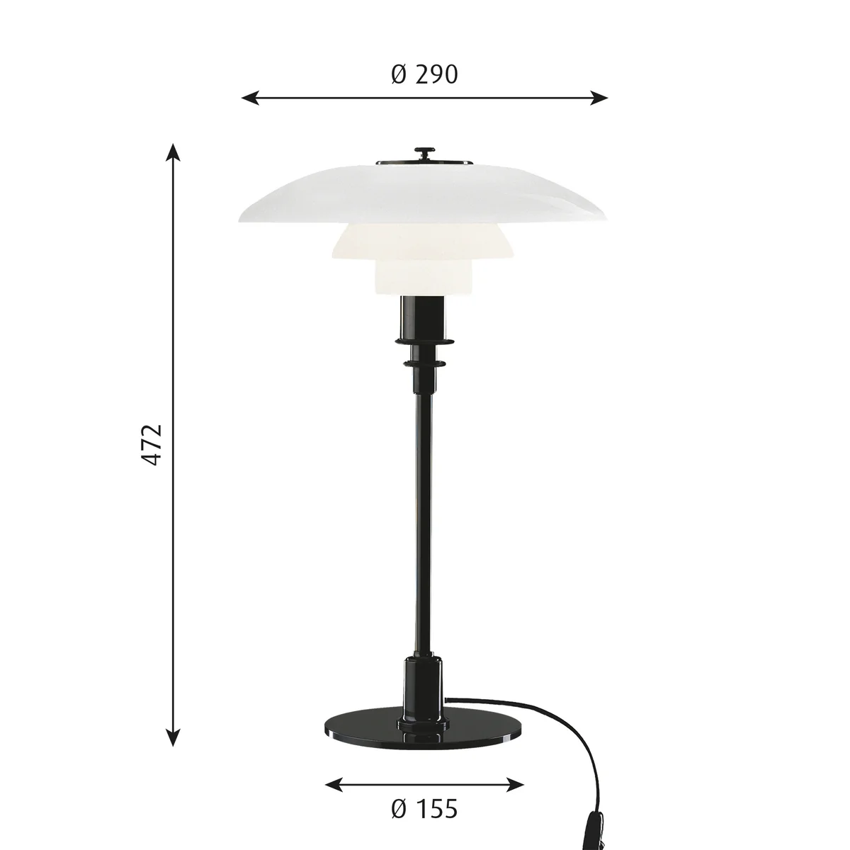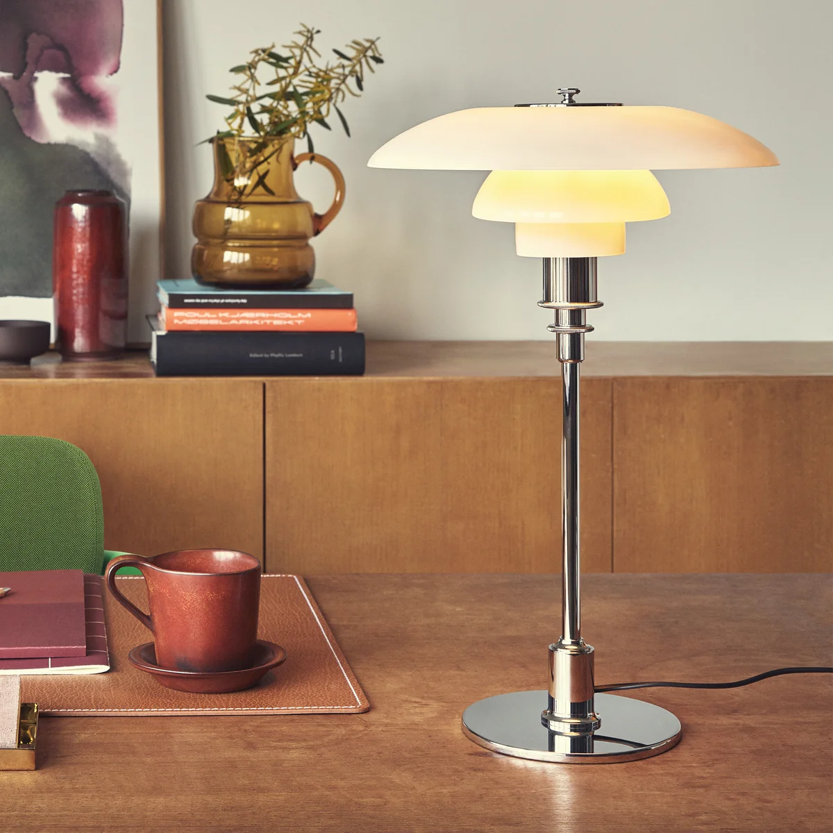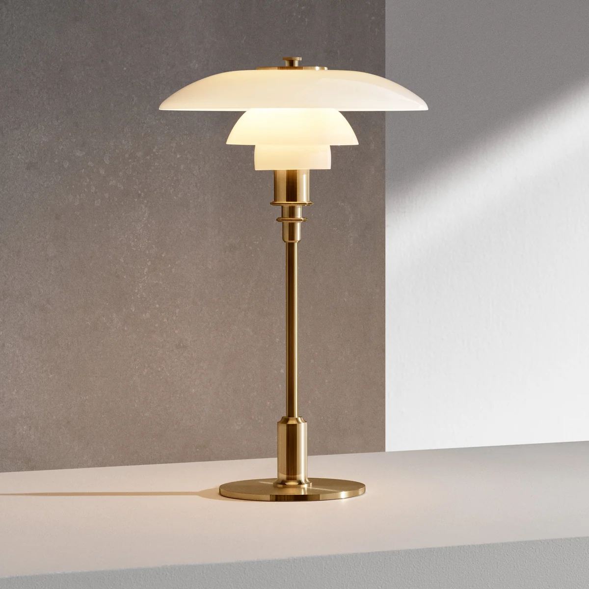 La lampe de table PH 3/2 fait partie de la famille des abat-jour PH3. La série de Poul Henningsen a été imaginée pendant quelques mois mouvementés de l'hiver 1923-26 pour un hall d'exposition à Copenhague, appelé "Forum". Le système d'abat-jour PH 3 était au départ une solution de luminaire suspendu, mais il a très vite évolué vers d'autres types de luminaires pour les tables, les sols, les murs et un grand nombre de lustres. En conséquence des différentes tailles, matériaux, surfaces et sources lumineuses, plus de mille variantes ont été développées au fil des ans. Aujourd'hui, la série est devenue un classique scandinave de renommée mondiale.