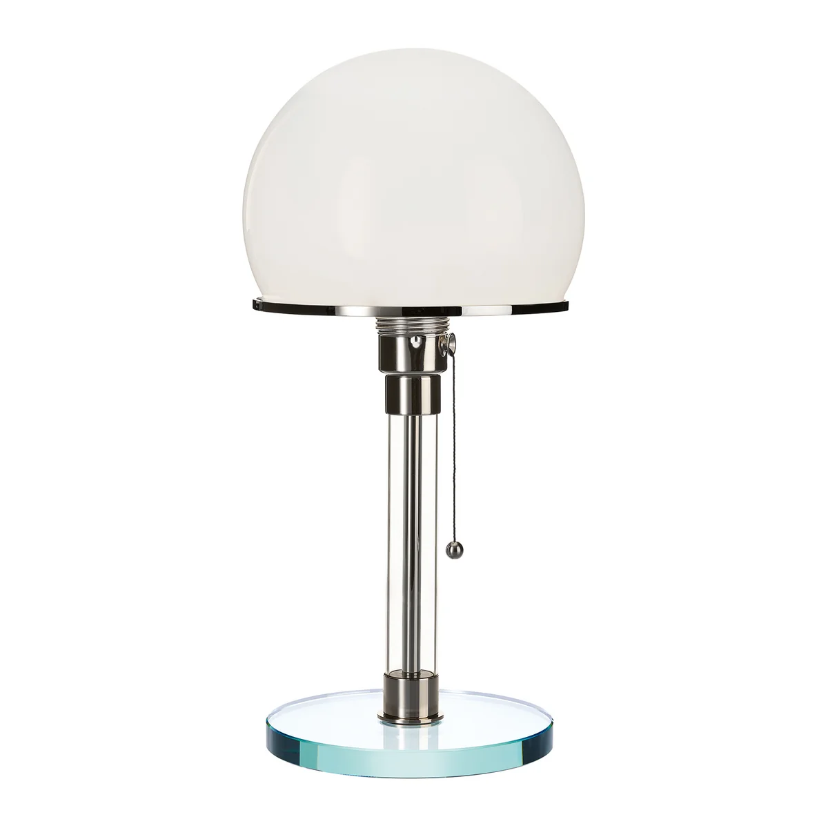 La lampe WG 24 Wagenfeld se compose d'une coupole en verre opale, le pied et la colonne sont en verre transparent et les encadrements en métal nickelé. Les demi-sphères métalliques sous le pied donnent au luminaire sa "légèreté".