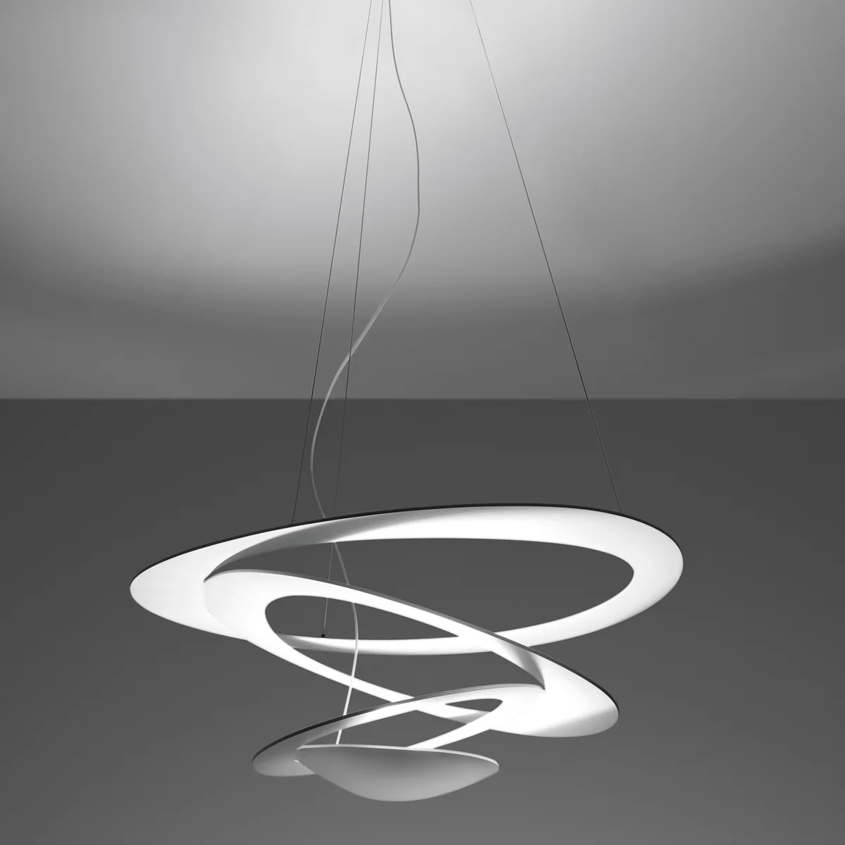 Le Pirce Mini Sospensione été conçu par Giuseppe Maurizio Scutellà pour le fabricant d'éclairage italien Artemide . Le design de Pirce Mini ressemble au résultat d'une coupe de silhouette: le disque fin se fond dans des anneaux légèrement incurvés qui s'enroulent vers le bas. En fonction de la durée de suspension, la silhouette du Pierce devient plus plate ou allongée.