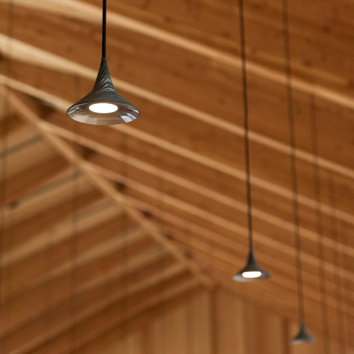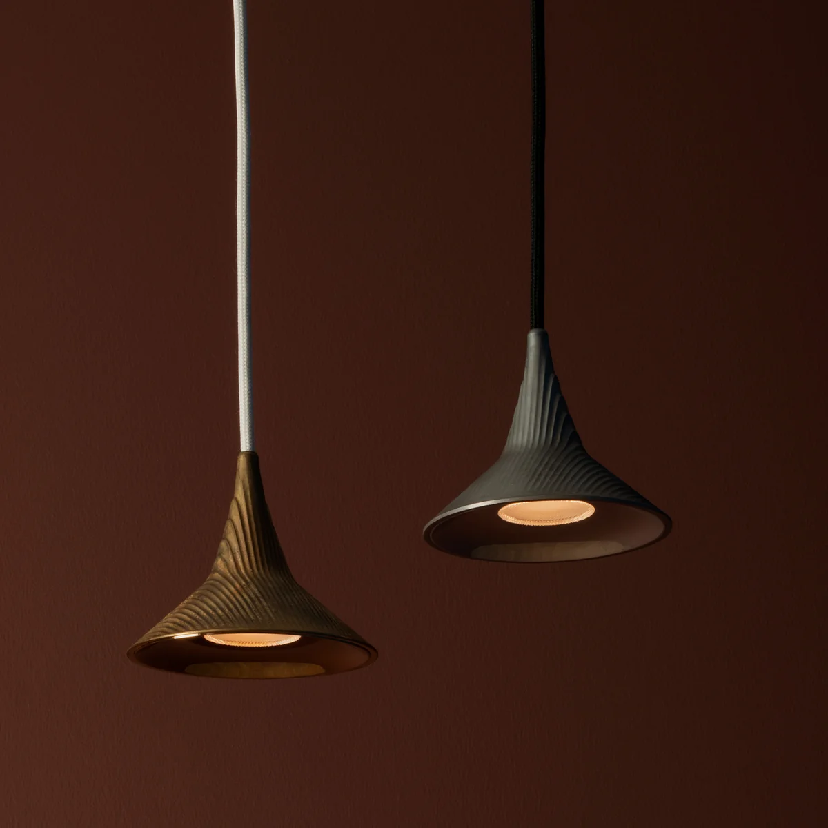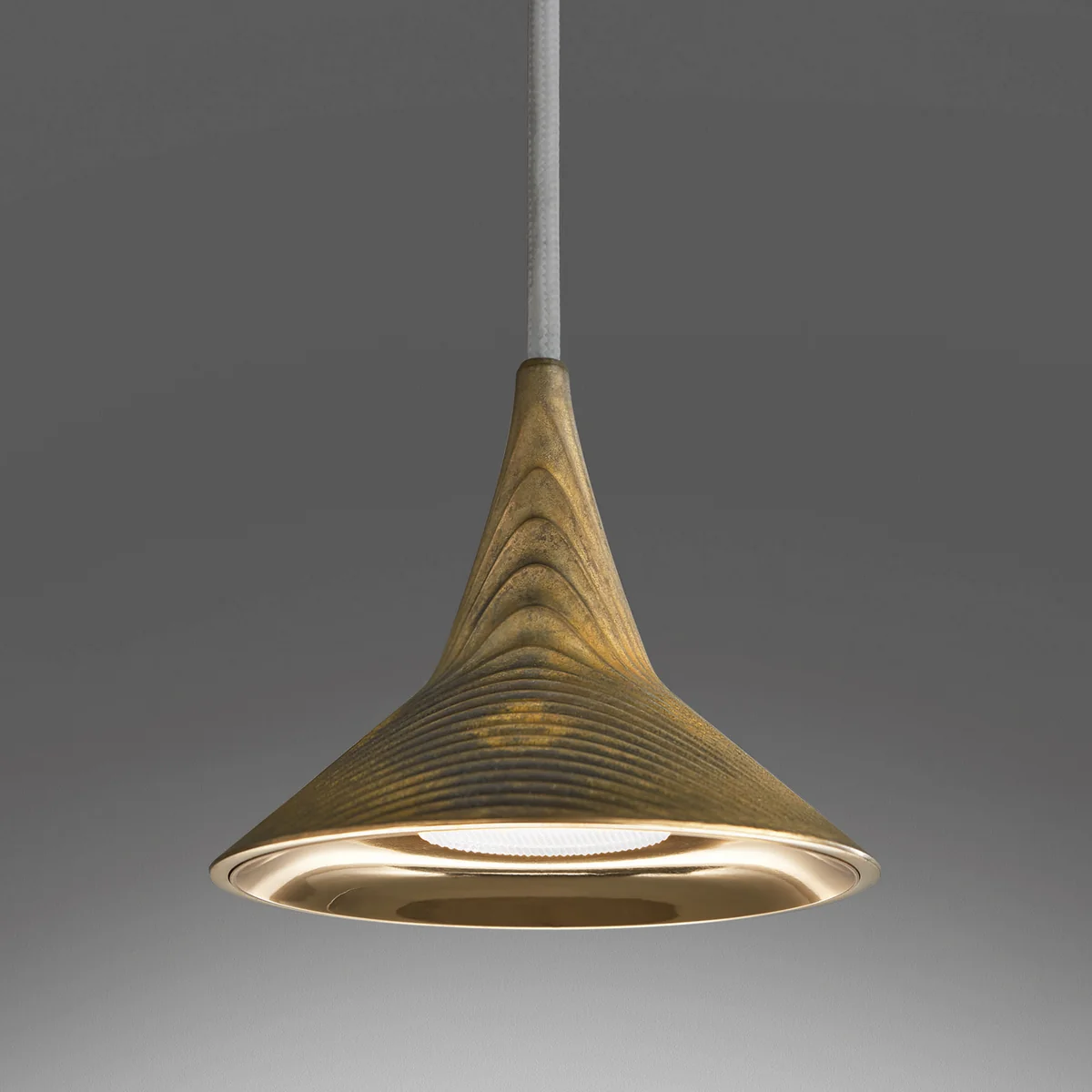 Le luminaire suspendu est fabriqué en aluminium ou en laiton et dispose d'un baldaquin en technopolymère et d'une plaque de fixation au plafond en acier. Le corps du luminaire dirige la lumière vers le bas et sert également à dissiper la chaleur. Ainsi, la suspension convient parfaitement au-dessus des tables pour manger ou travailler.