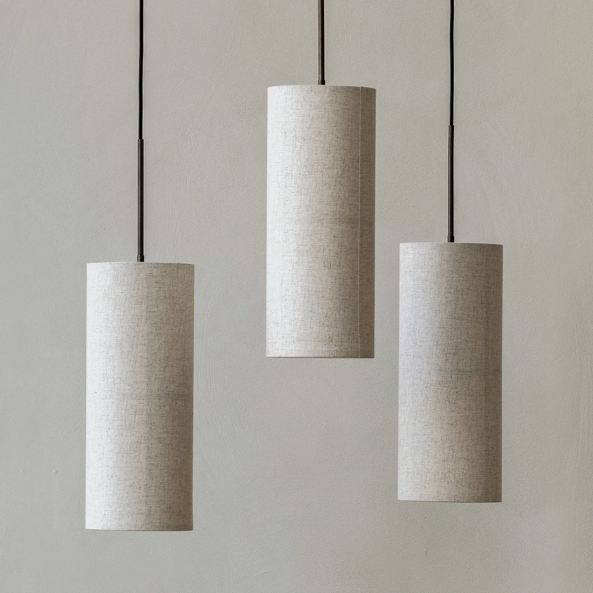 La lampe Hashira Suspension de Audo est une création du studio de design Norm Architects, qui s'est inspiré des lanternes traditionnelles japonaises en papier de riz. La lampe à pédale est fabriquée en tissu de lin semi-transparent, qui laisse passer la lumière avec douceur. Lorsque le luminaire est allumé, la grille grossière à l'intérieur est également visible par une ombre, ce qui confère une certaine structure au luminaire.