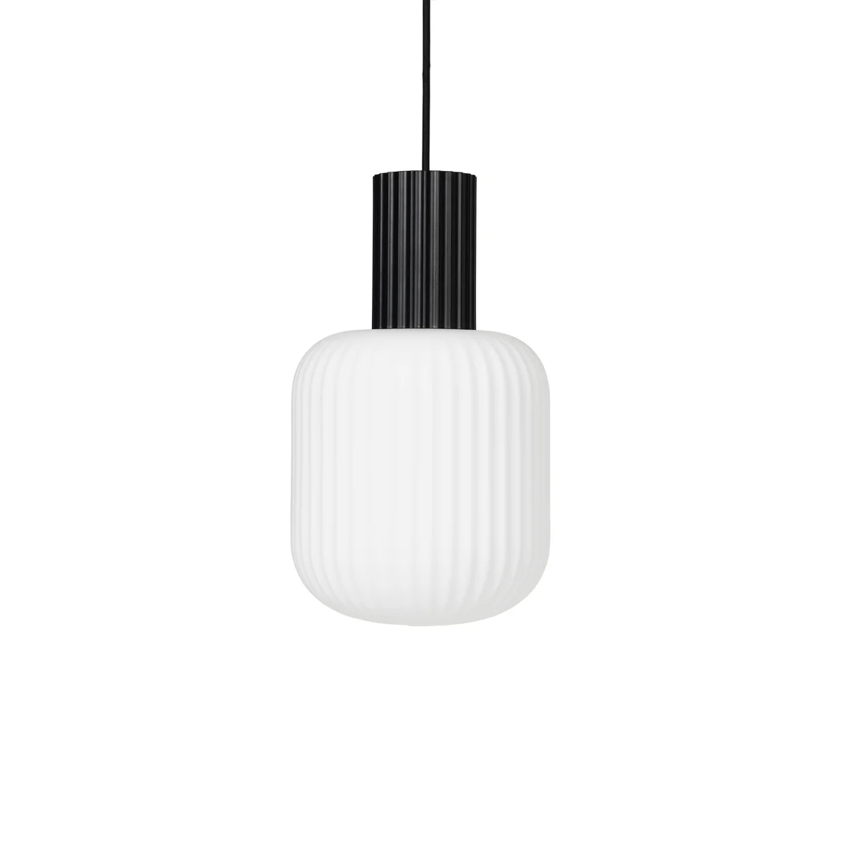 Broste Copenhagen fabrique la lampe suspendue à partir d'un socle en fer recouvert de poudre et d'un abat-jour en verre opale. Le produit est disponible en différentes tailles et couleurs de base.