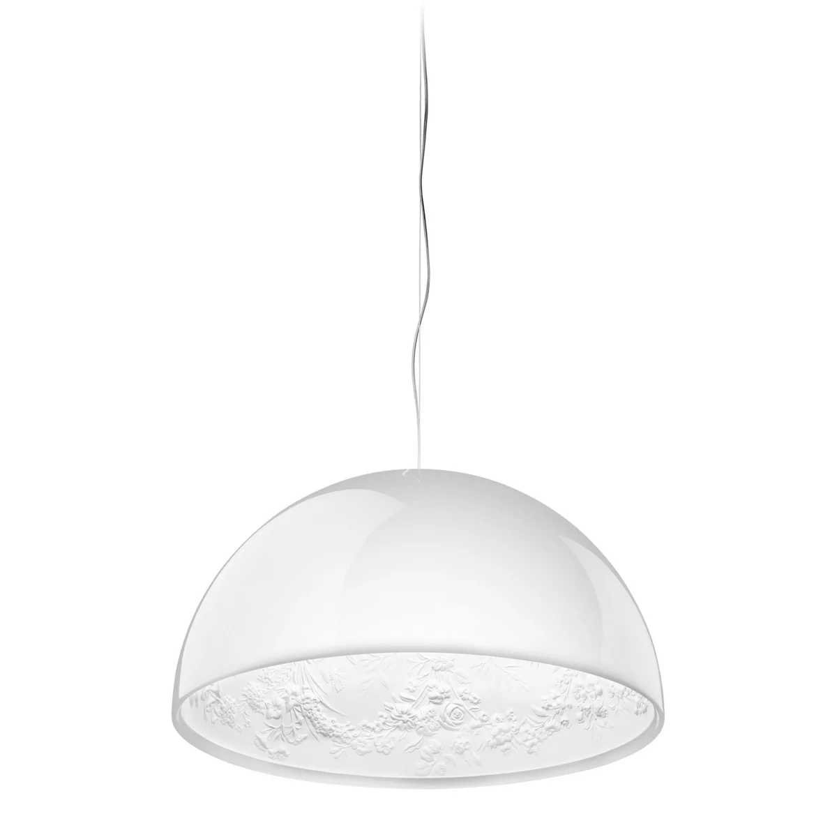 Skygarden offre une lumière diffuse et surprend par un mélange de matériaux inhabituel pour un luminaire suspendu : l'intérieur du dôme est fait de plâtre moulé traité mécaniquement, qui ressemble à un stuc ancien avec des motifs floraux. La surface extérieure est disponible en deux surfaces peintes brillantes (noir et blanc) ou deux surfaces mates (brun rouille et or).