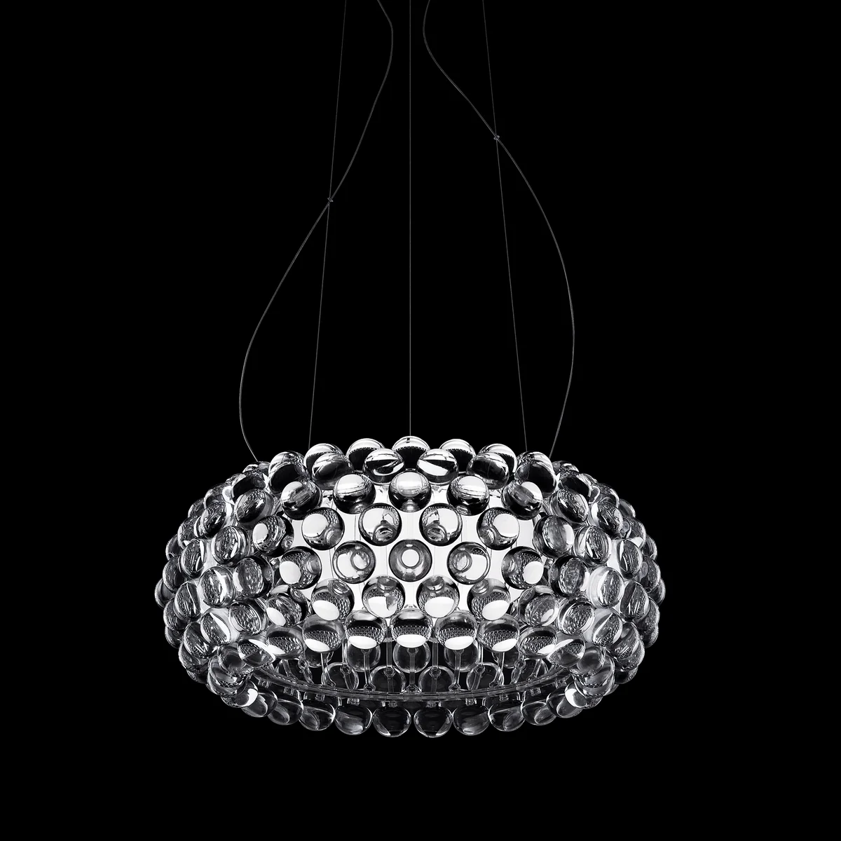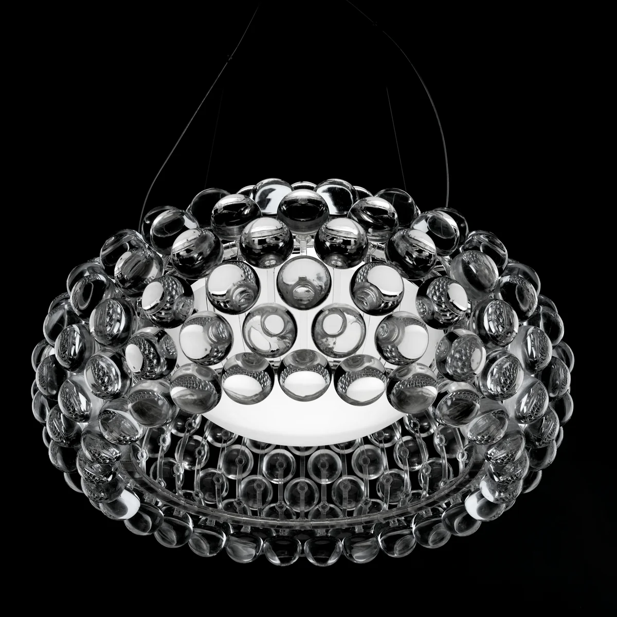 Un bijou de créativité, mais aussi de technologie. Avec un seul élément sphérique et une structure modulaire en forme d'arc, il est possible de créer toute une collection de modèles. Lorsque l'on allume le Foscarini Caboche, la lumière pénètre de l'intérieur dans les espaces libres entre les sphères transparentes et est en même temps diffusée de l'intérieur par celles-ci, comme de nombreux cristaux lumineux. Ce sont des diamants Non, c'est du plexiglas. La structure et les sphères transforment l'idée initiale de Patricia et Eliana en une forme pure de lumière, qui prend une expression différente selon le point de vue d'où on la regarde. Chaque sphère fait face à la lumière de différentes manières et la restitue de la façon la plus originale possible, de sorte qu'elle devient elle-même une source de lumière.
