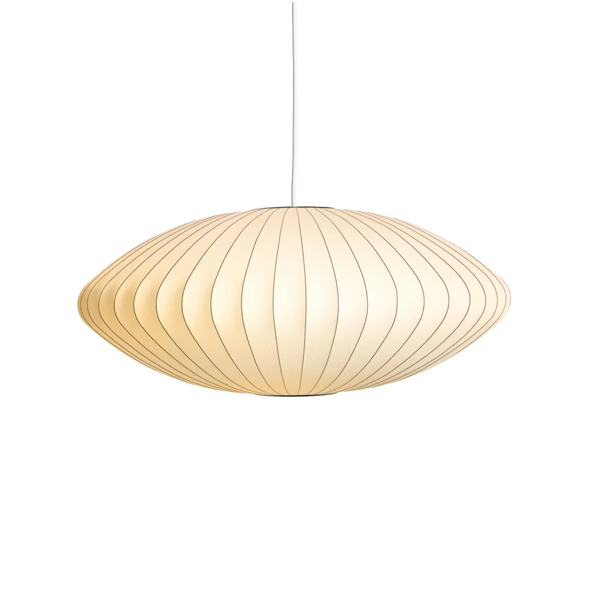 La suspension Nelson Saucer Bubble est un objet de design emblématique de l'époque du Mid-Century. Conçue en 1952 par George Nelson, elle compte encore aujourd'hui parmi les classiques du design d'intérieur moderne. Avec sa forme légèrement organique et son abat-jour blanc cassé en polymère translucide, elle crée une lumière chaude et diffuse qui confère une atmosphère confortable aux salons, salles à manger ou chambres à coucher.