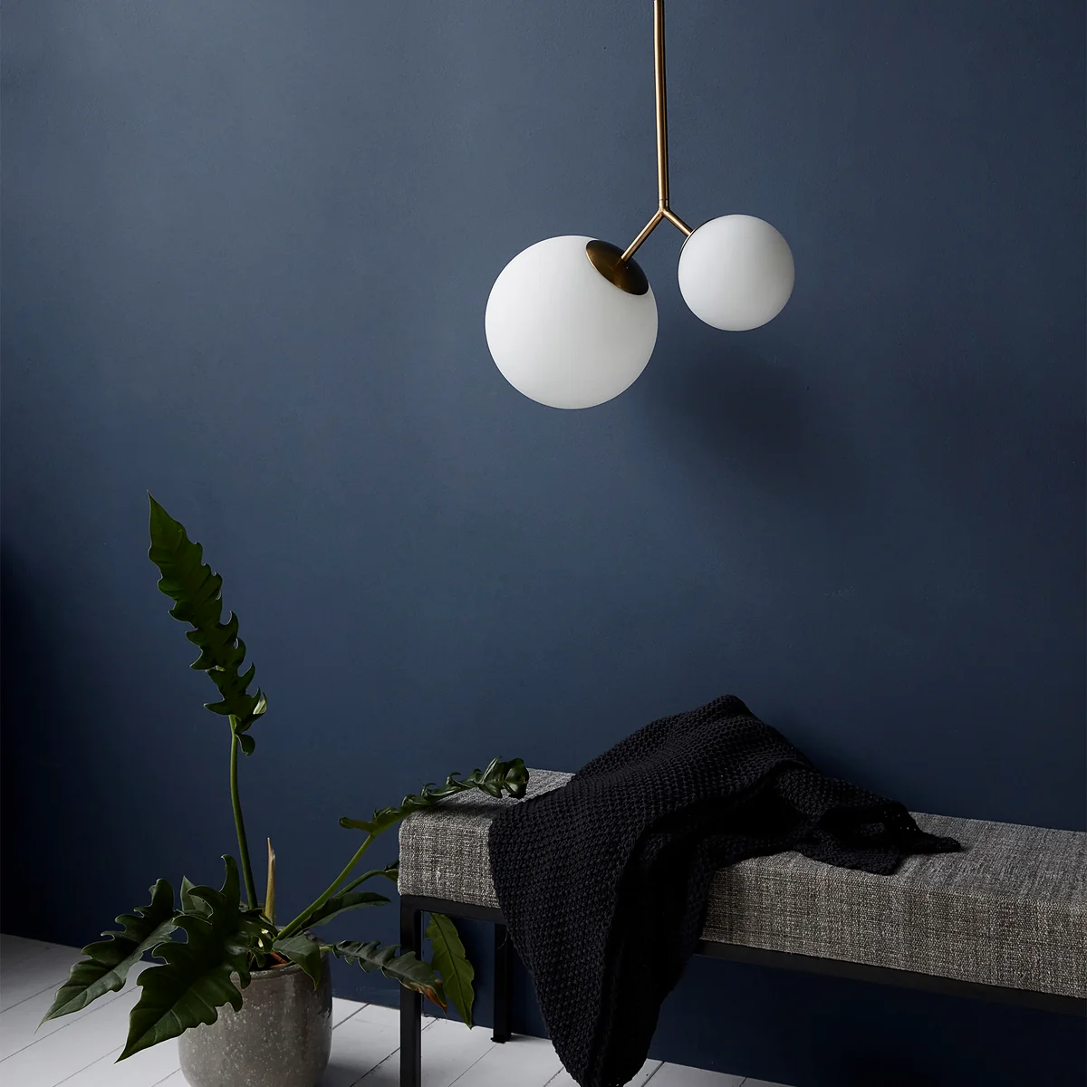 Deux abat-jours ronds en verre fait à la main sont complétés par des détails en laiton brillant, de sorte qu'une apparence générale harmonieuse est créée. Aménagée dans le couloir, dans la cuisine ou au-dessus de la table à manger, la suspension Twice est un véritable accroche-regard.