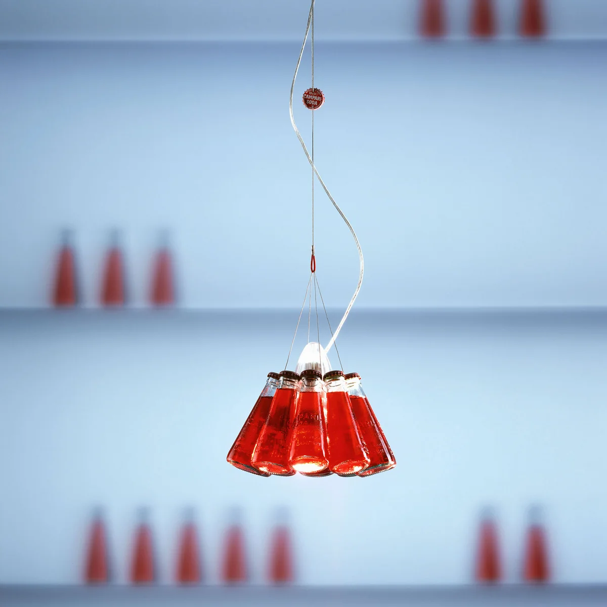 La couleur des bouteilles de Campari font office d’abat-jour, au centre duquel se trouve la source lumineuse. La lumière rayonne non seulement vers le bas, mais également au travers des bouteilles de Campari. Le contenu des bouteilles donne une touche colorée de l’éclairage. Mis à part les bouteilles colorées, la construction de la suspension lumineuse est minimaliste et réduite.
