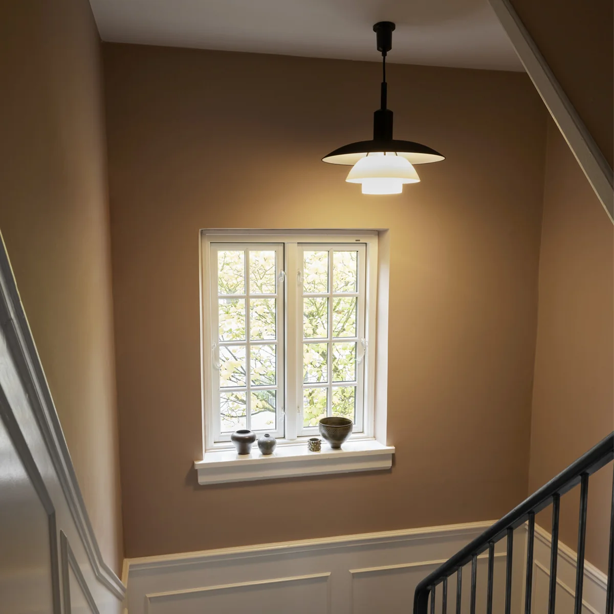 Le PH 5/5 luminaire suspendu de Louis Poulsen offre une lumière 100% sans éblouissement. Le design de la suspension est basé sur le principe d'un système de trois écrans réfléchissants qui dirige une grande partie de la lumière vers le bas. Le PH 5/5 Le luminaire émet de la lumière aussi bien vers le bas que sur les côtés et s'éclaire lui-même.
