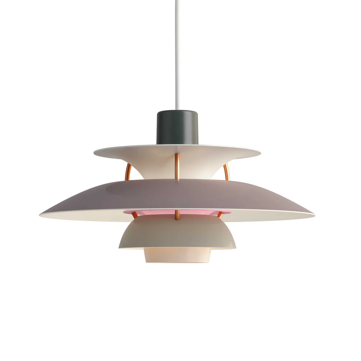 Henningsen a conçu le PH 5 en réponse aux changements constants de forme et de taille des lampes à incandescence. Il a développé un luminaire qui, indépendamment de la façon dont le luminaire est monté et du type de lampe utilisé, est toujours resté totalement sans éblouissement. Henningsen souhaitait également utiliser le PH 5 pour améliorer le rendu des couleurs de la lampe. De petits écrans rouges et bleus ont été utilisés pour compléter la couleur dans la zone du spectre que l'œil percevait mal - à savoir le rouge et le bleu. Dans le même temps, la lumière est atténuée dans la zone moyenne jaune-vert, dans laquelle l'œil est le plus sensible. Le PH 5 Mini est lancé avec une nouvelle palette de couleurs innovante. La lampe joue avec les couleurs. Il commence par le ton le plus sombre en haut et devient plus doux d'un écran à l'autre.
