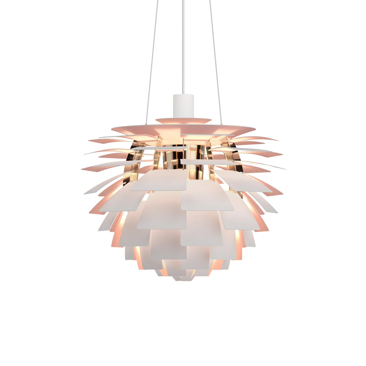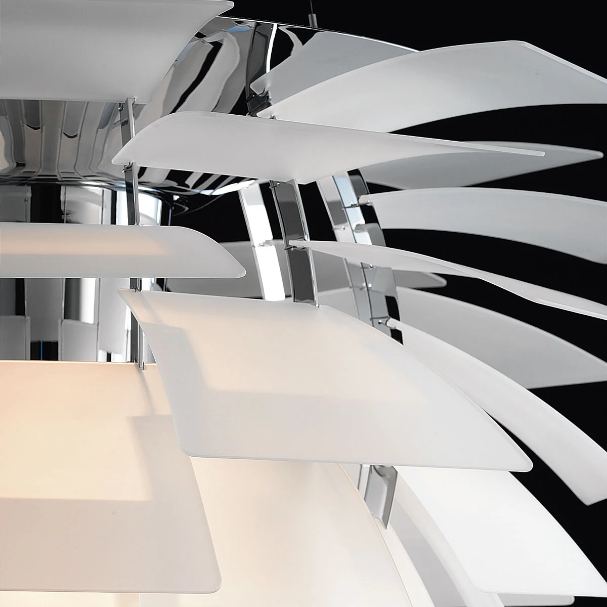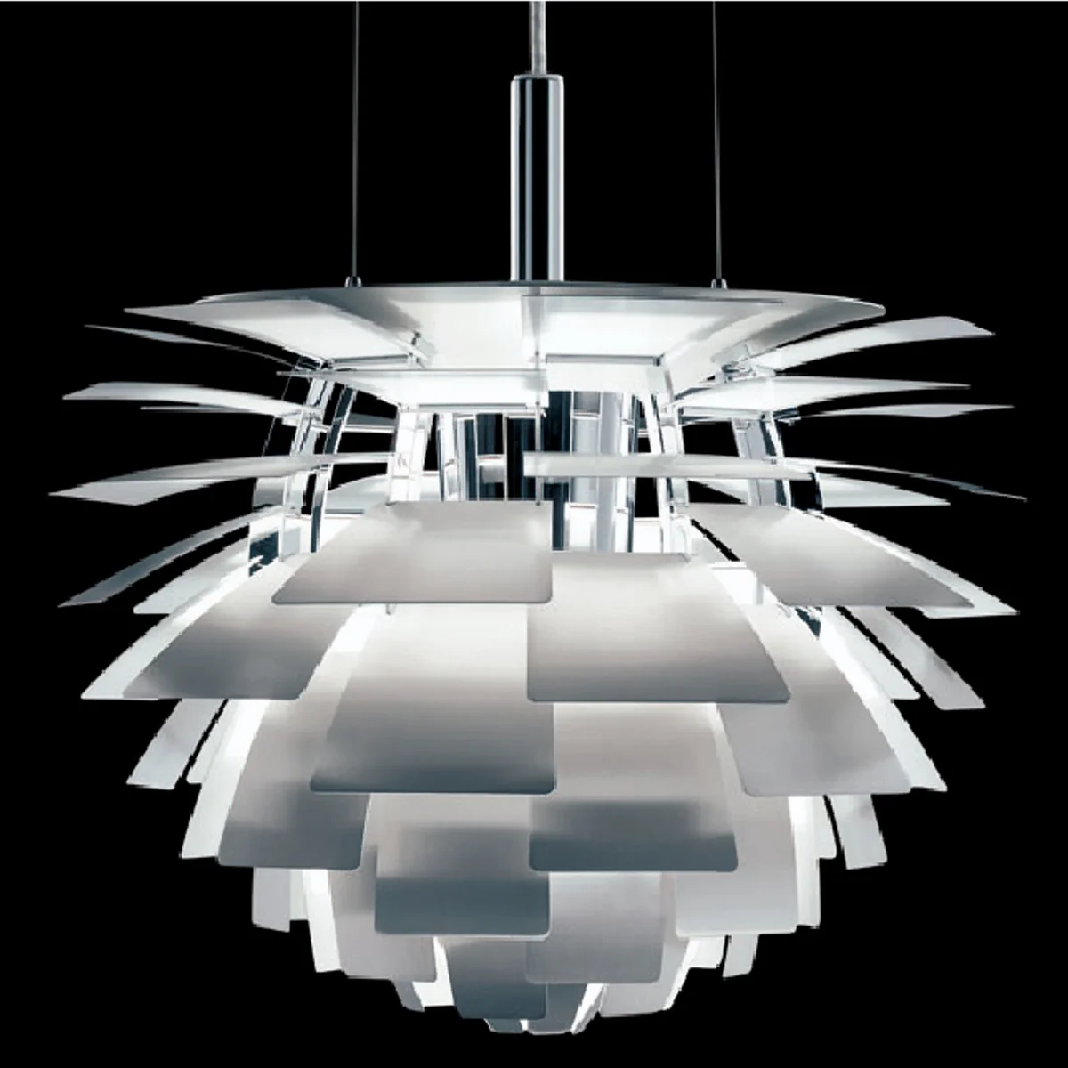 Comme chaque rangée est décalée par rapport à la précédente, les 72 feuilles peuvent se "couvrir" les unes les autres, créant ainsi un luminaire omnidirectionnel sans éblouissement dont la source lumineuse reste cachée, quelle que soit la perspective. La lumière est transmise et réfléchie sur les feuilles situées en dessous, créant ainsi un éclairage distinct et unique. Les premiers Artichoques ont été conçus pour un restaurant de Copenhague appelé Langelinie Pavilion - où ils sont toujours accrochés aujourd'hui.