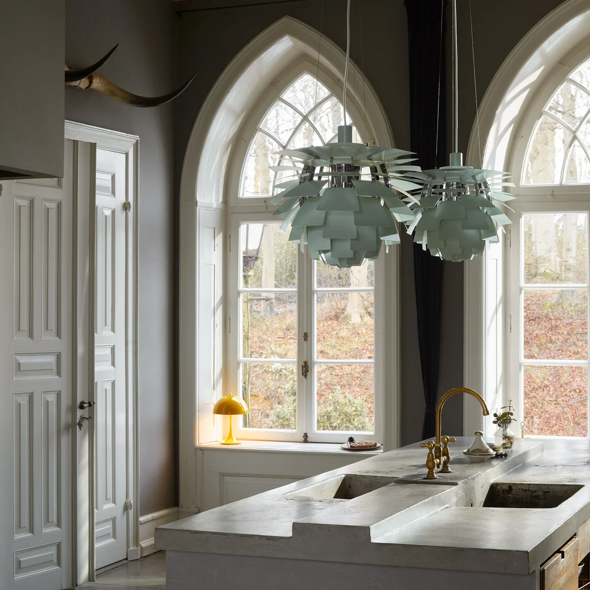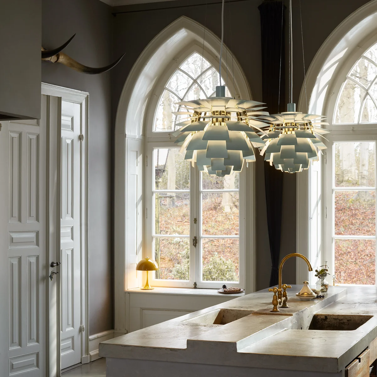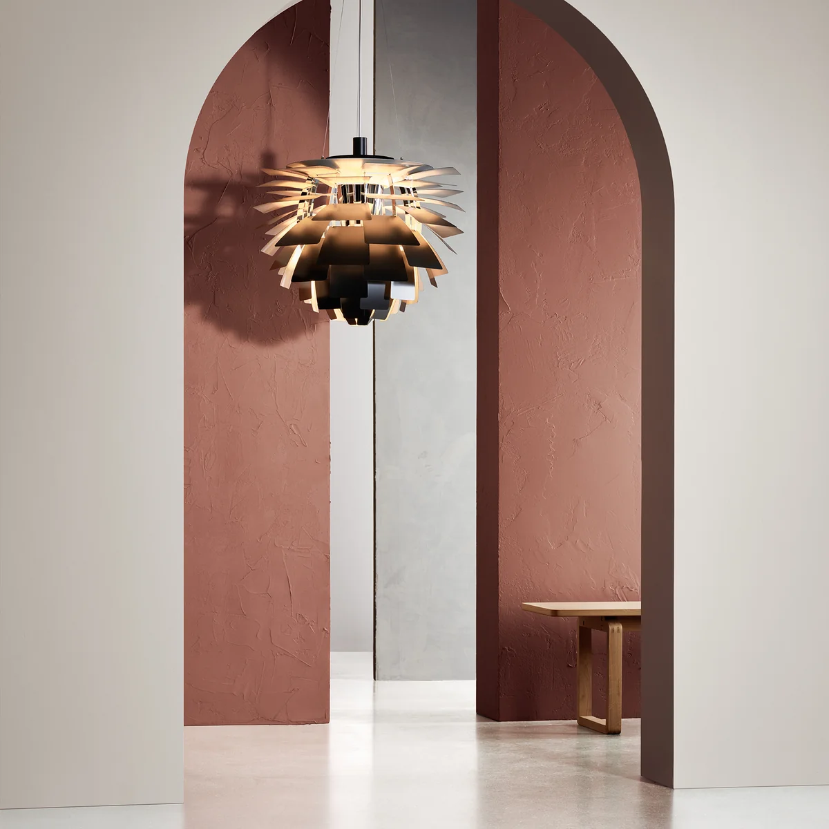 Comme chaque rangée est décalée par rapport à la précédente, les 72 feuilles peuvent se "couvrir" les unes les autres, créant ainsi un luminaire omnidirectionnel sans éblouissement dont la source lumineuse reste cachée, quelle que soit la perspective. La lumière est transmise et réfléchie sur les feuilles situées en dessous, créant ainsi un éclairage distinct et unique. Les premiers Artichoques ont été conçus pour un restaurant de Copenhague appelé Langelinie Pavilion - où ils sont toujours accrochés aujourd'hui.
