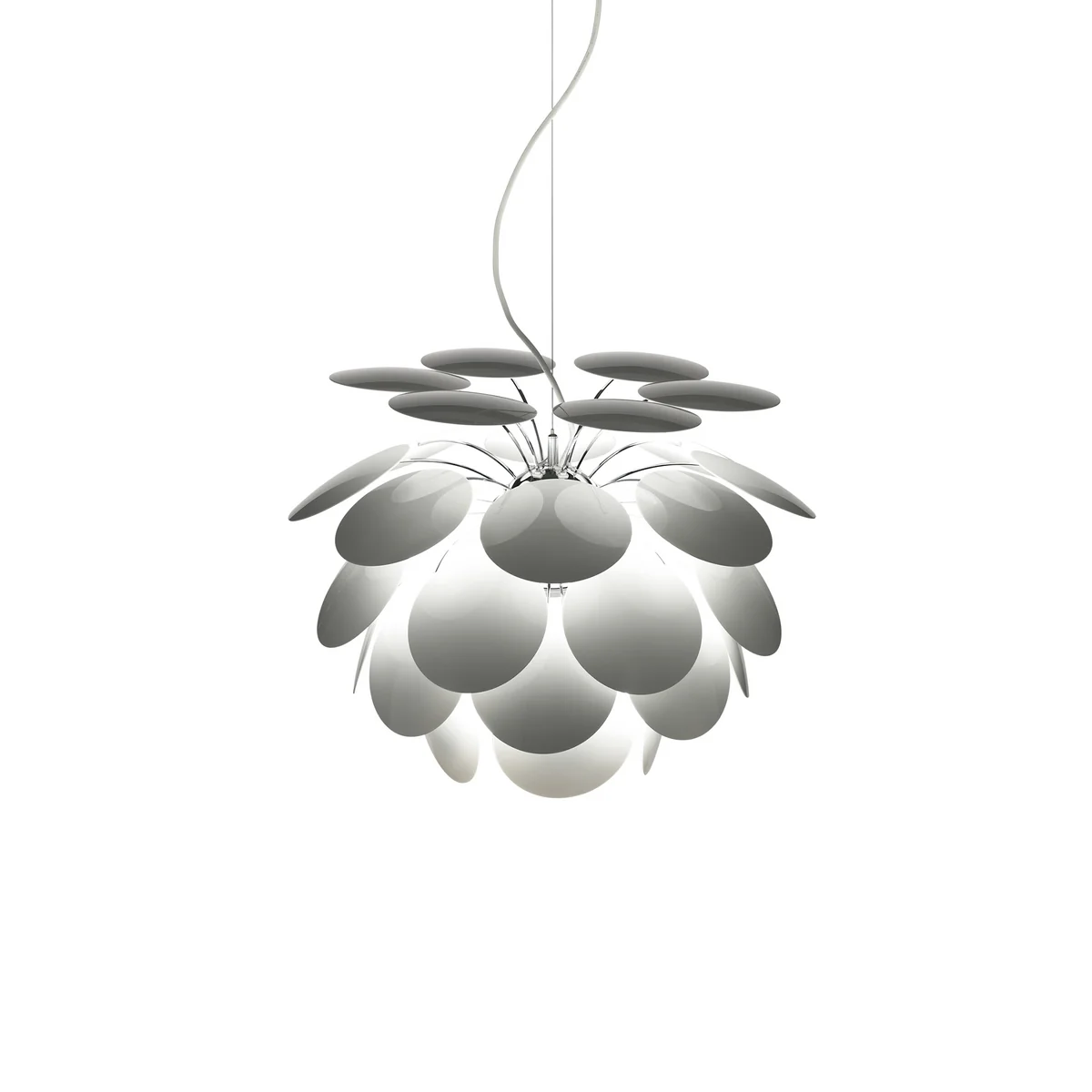 La lumière incidente et celle qui est renvoyée par les deux côtés des 35 disques confèrent à la suspension un caractère unique. Discocó luminaire suspendu une gradation extraordinaire de nuances de lumière et de profondeur. Les réflexions de la sphère chromée au cœur font partie de ce jeu de lumière unique.