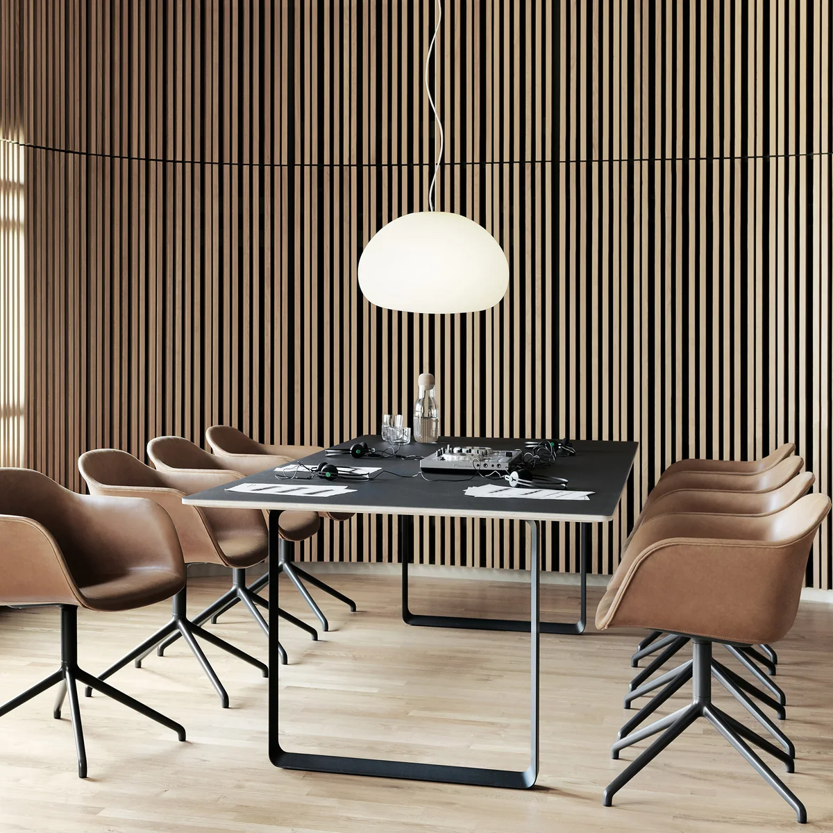 La lampe Fluid luminaire suspendu a été conçu par le bureau d'architecture et de design Claesson Koivisto Rune pour l'entreprise danoise Muuto . Le design du luminaire se distancie volontairement des formes géométriques strictes et possède un langage des formes naturel avec des lignes douces et arrondies.