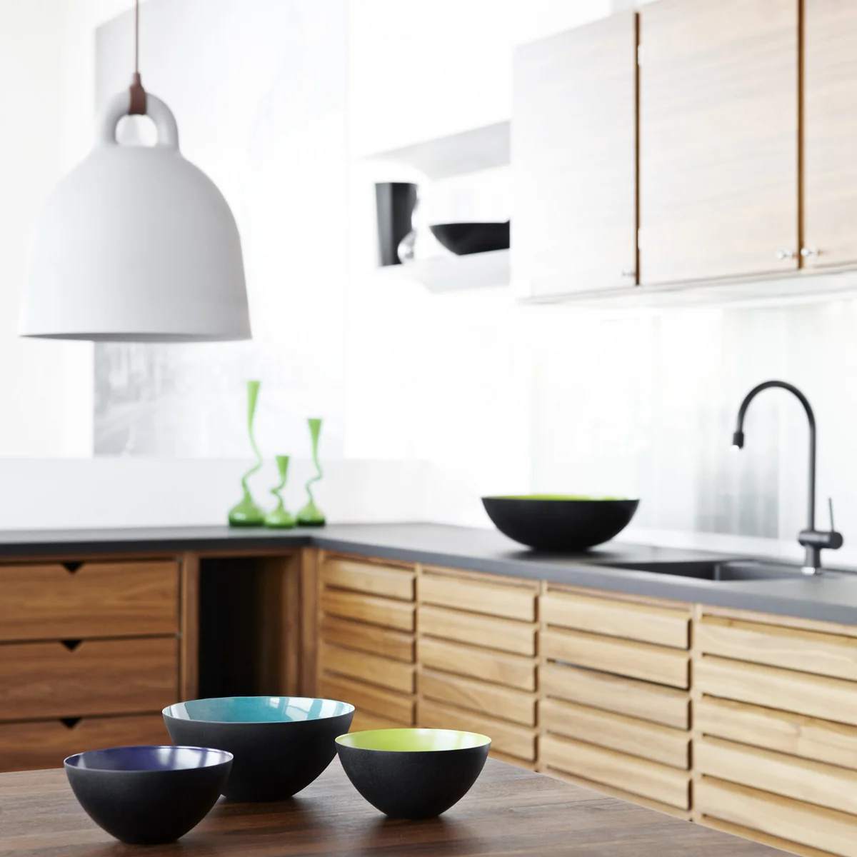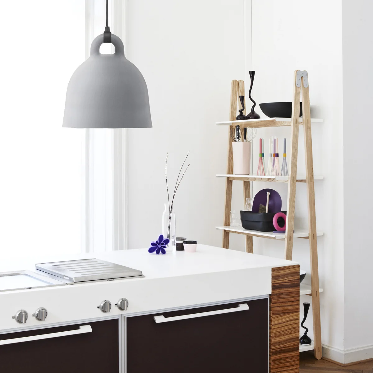 La Bell de Normann Copenhagen est une lampe à éclairage directionnel qui, selon le côté depuis lequel elle est observée, change de personnalité et véhicule de nouvelles expressions. La partie intérieure claire réfléchit la lumière directe qui se diffuse de manière conique et qui pourrait par exemple constituer un bon éclairage au dessus de la table de repas. C'est surtout la combinaison de différentes tailles qui fait de la Bell le centre de tous les regards.