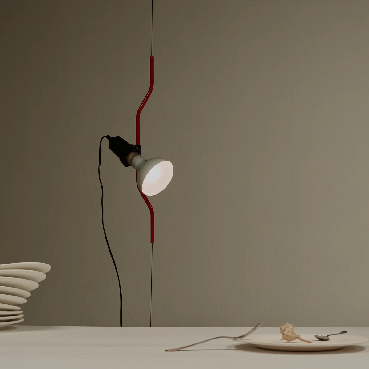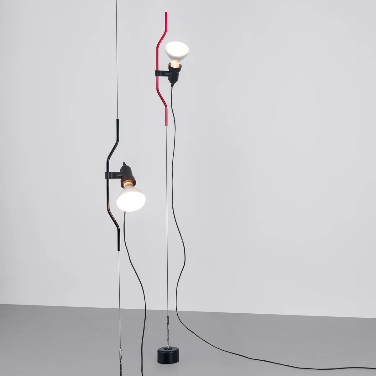 Réglage de la hauteur du corps du luminaire possible en faisant glisser un tube d'acier moulé, laqué liquide (noir, blanc, rouge) ou nickelé, sur un câble d'acier tendu du plafond au sol sur toute la hauteur de la pièce (longueur utile : 400 centimètres).