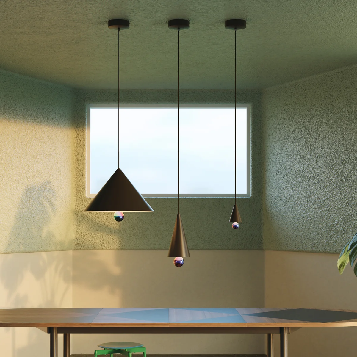Le site Cherry Le luminaire suspendu à LED a été conçu par le duo de designers australiens Daniel et Emma pour Petite Friture . Il présente un design minimaliste et simple. Le pendentif se compose d'un cône en aluminium avec une boule scintillante à la base, qui reflète et amplifie la lumière. Cherry convient comme éclairage d'appoint dans le salon ou comme suspension expressive au-dessus de la table à manger. De tailles et de couleurs différentes, les luminaires suspendus à LED peuvent être combinés les uns avec les autres pour créer une disposition artistique des lampes.