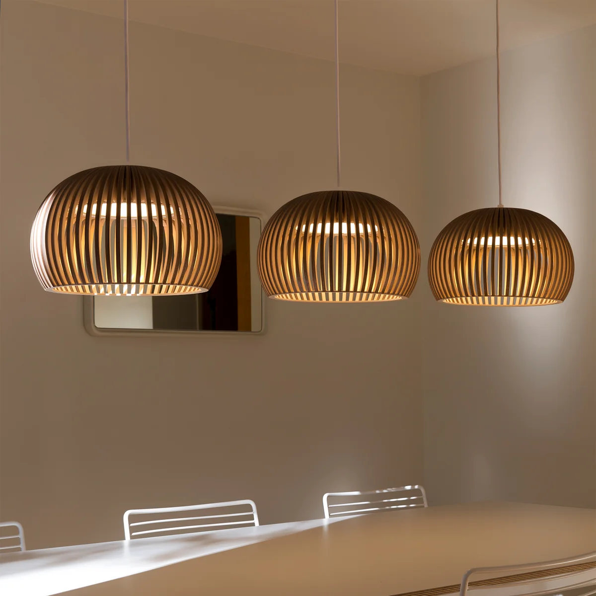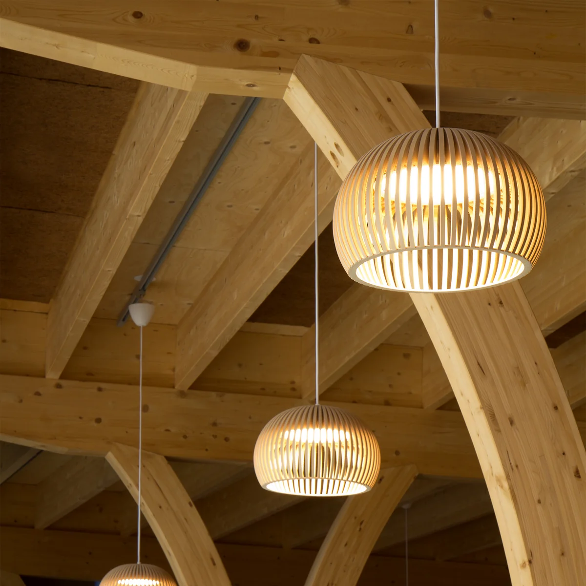 Le luminaire suspendu est fabriqué à la main en bois de bouleau moulé en Finlande. Le bois permet à la lumière de pénétrer en douceur, créant une atmosphère agréable et attirant le regard dans la pièce. Dans le couloir, le luminaire suspendu Atto devient une source lumineuse et dans le salon un objet lumineux décoratif au-dessus du canapé.