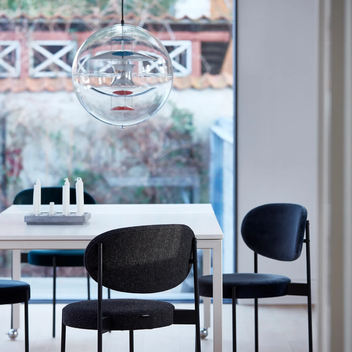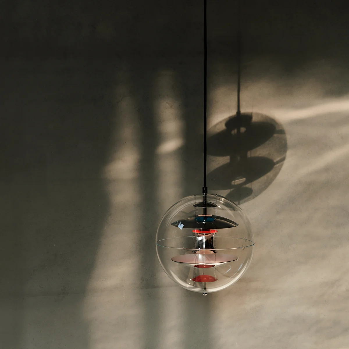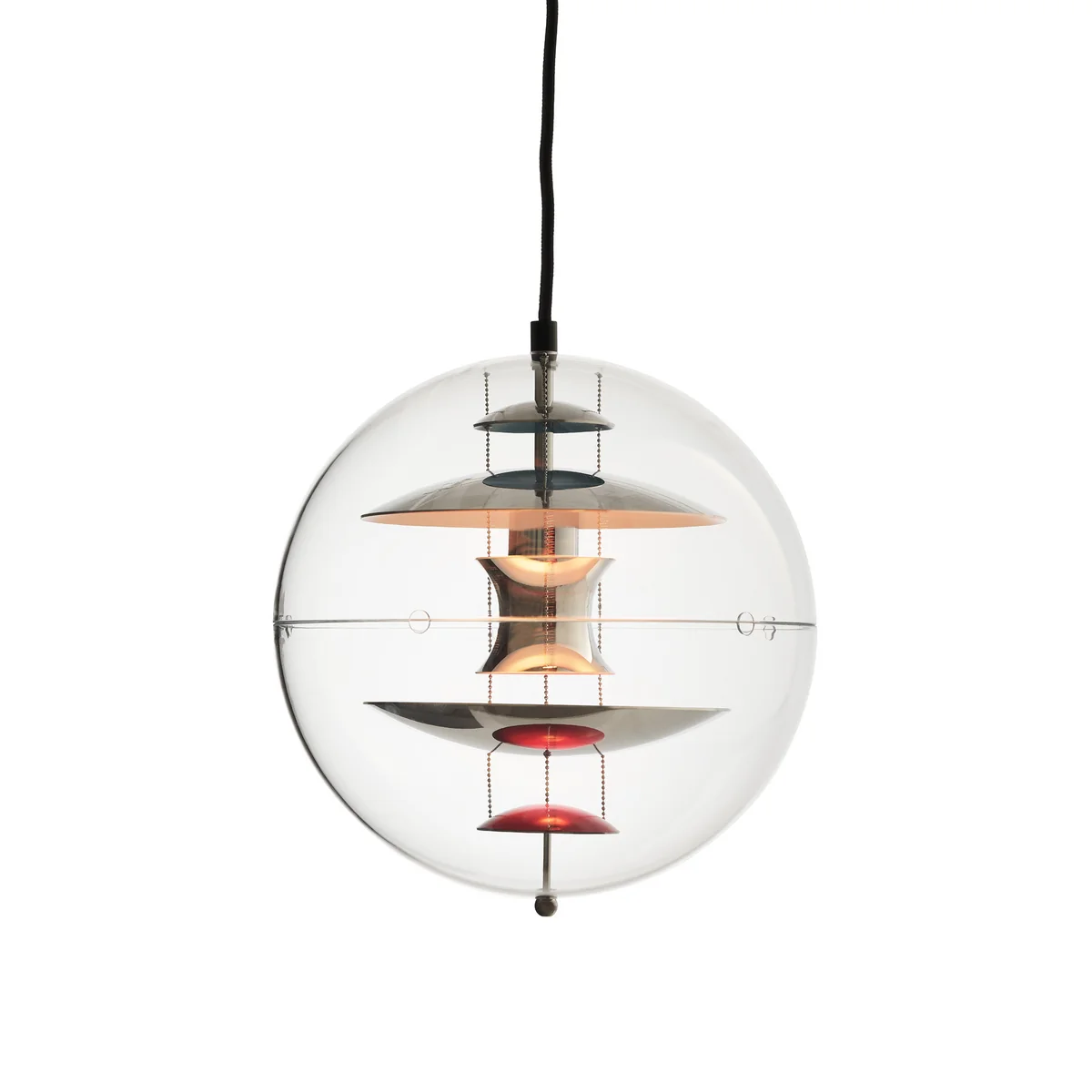 Contrôlabilité, transparence et couleurs sont les caractéristiques essentielles du VP Globe . La sphère en verre acrylique donne l'impression d'une bulle d'air d'où sort la lumière. À l'intérieur de la sphère, cinq réflecteurs au total sont suspendus à trois fils d'acier. Ils entourent la source lumineuse située au centre.