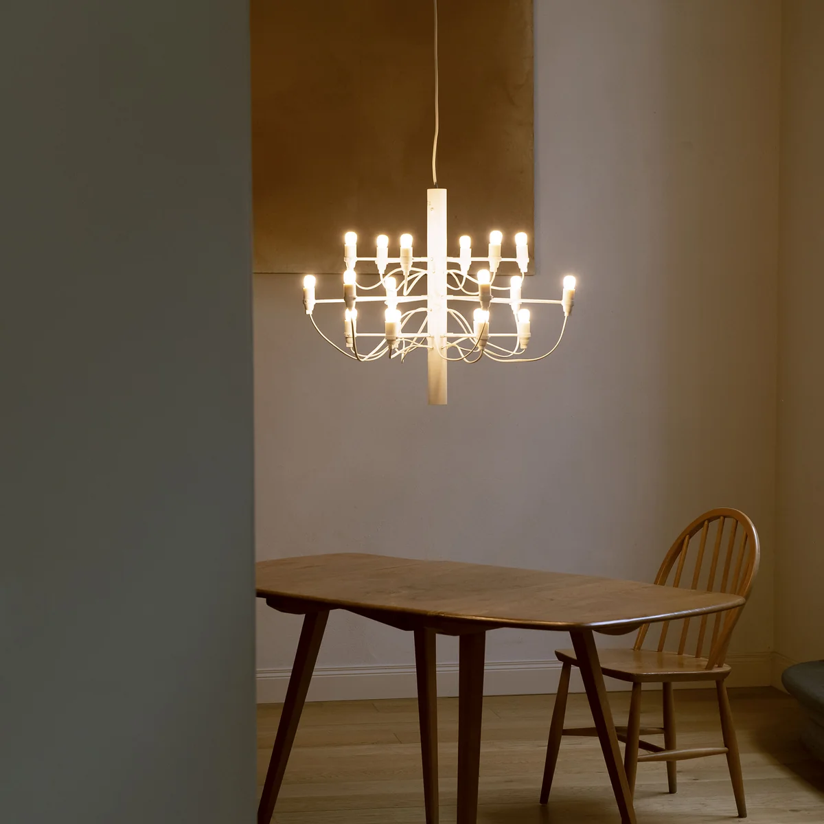 Le lustre 2097 a été conçu dès 1958 par Gino Sarfatti et est une interprétation moderne du lustre classique. Un tube d'acier au centre cache les câbles d'alimentation partant des ampoules, ce qui donne un design plein d'élan et pourtant sobre.