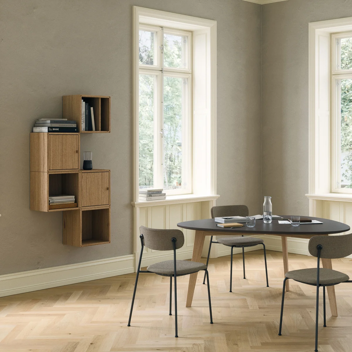 Avec leurs modules carrés, ces unités offrent des possibilités d'agencement infinies, deux modules et les étagères correspondantes pouvant être positionnés dans différentes configurations. Derrière les portes, les fournitures de bureau peuvent être rangées de manière ordonnée et invisible, tandis que les étagères ouvertes apportent une touche de chaleur à l'ambiance du bureau. Dans les salles de réunion, ces modules offrent un espace de rangement pour des objets tels que la vaisselle de réunion, soit cachée derrière des portes fermées, soit exposée ouvertement, soit une combinaison des deux approches. Dans les cantines, les modules ouverts se transforment en solutions de rangement astucieuses pour les verres, les couverts, les assiettes et autres.