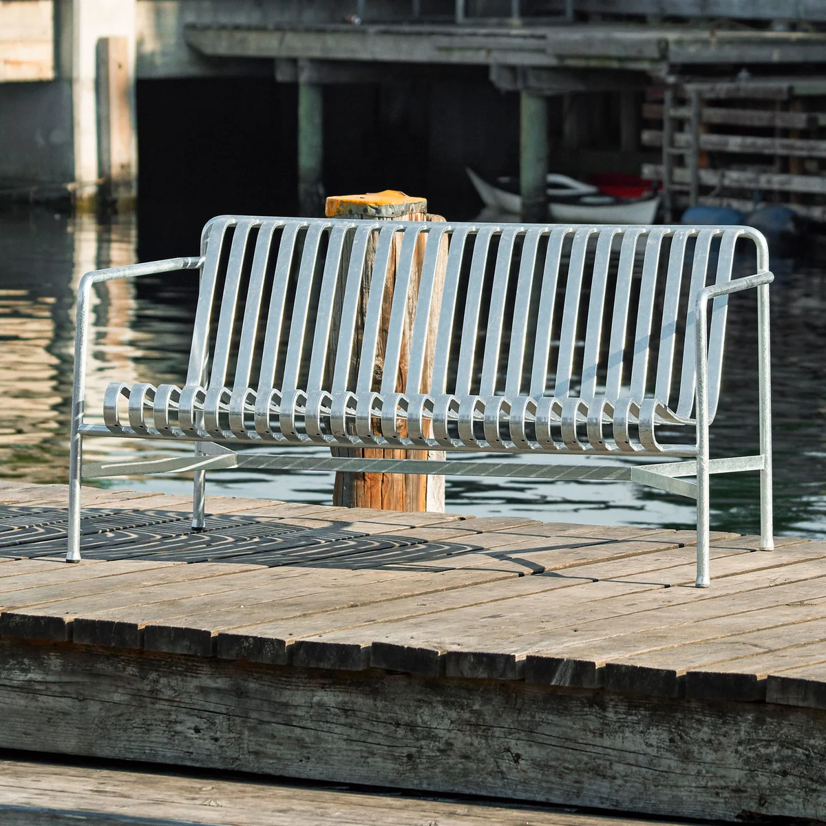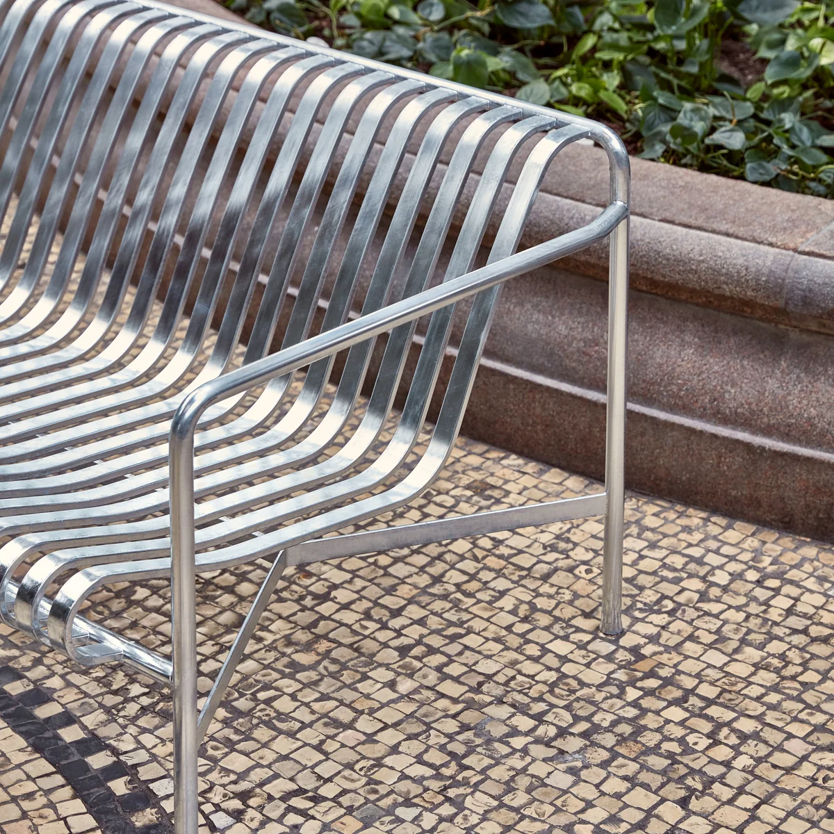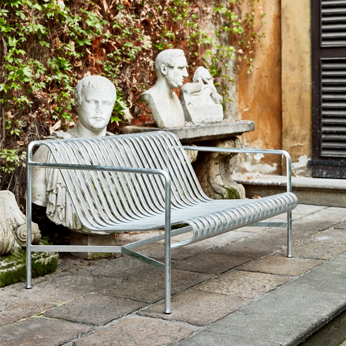 Avec la collection Palissade, les frères Ronan et Erwan Bouroullec ont créé une série de meubles de jardin qui convient parfaitement à l'extérieur. Comme tous les autres meubles de la série, le canapé est constitué d'une surface rainurée en lattes d'acier revêtues par poudre. L'avantage est que l'eau de pluie s'écoule facilement à travers les rainures et ne s'accumule pas en une flaque.