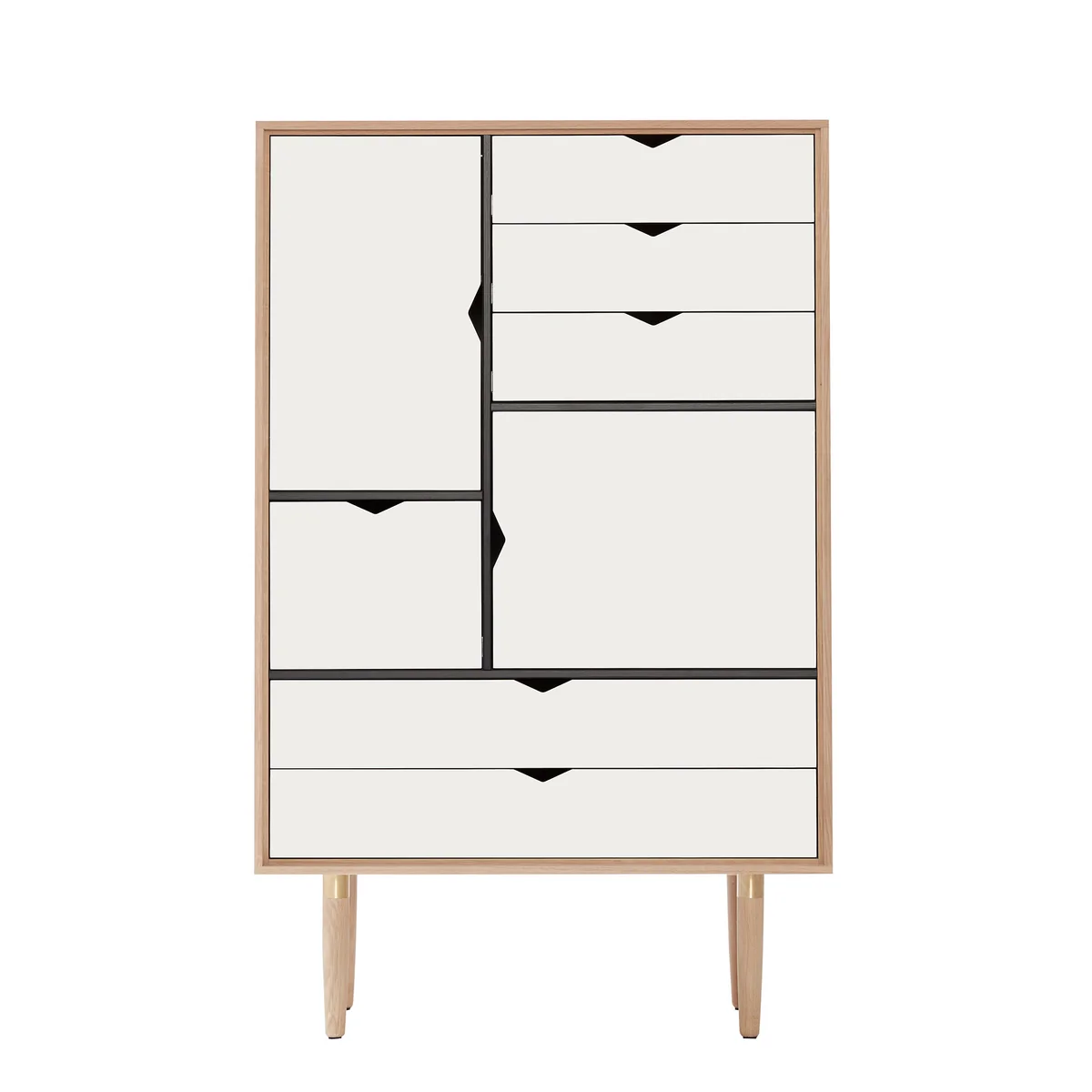 S5 est fabriqué en chêne massif huilé, savonné ou laqué noir ou en noyer massif huilé avec des assemblages à tenon et mortaise et a des pieds tournés avec une finition en laiton. La variante monochrome de S5 dispose de faces avant de tiroirs et de portes d'un blanc sobre. S5 Mais elle existe également en version multicolore. Celle-ci se distingue par les couleurs argent, gris métal et beige sur les tiroirs et les portes.