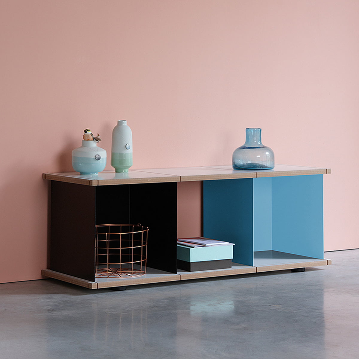 Les caissons en tôle d'acier thermolaqués en différentes couleurs se marient de manière intemporelle avec les planches intermédiaires en MDF, rendant le système d'étagères à la fois moderne et flexible. Les possibilités d'utilisation du système extensible sont infinies.