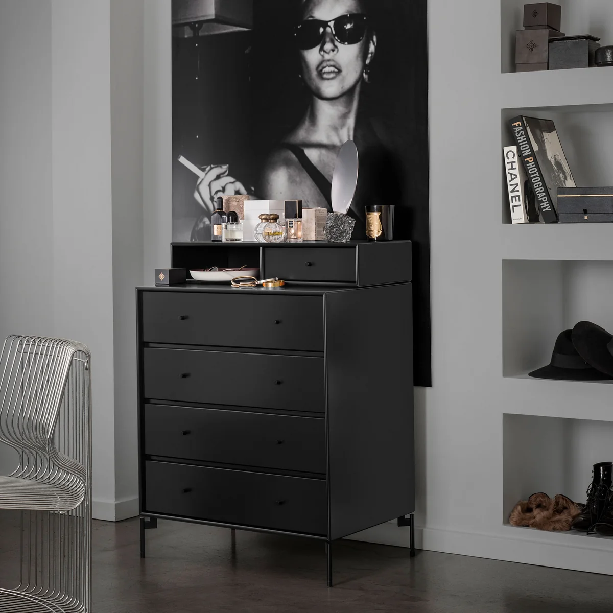 La commode Keep de Montana est une commode classique pour les bijoux et les vêtements, conçue par Peter J. Lassen. La commode d'une hauteur d'environ 95 cm s'intègre parfaitement dans la chambre à coucher, le salon ou le couloir. Elle offre suffisamment de place dans quatre grands tiroirs, un petit tiroir sur le plateau et un petit compartiment ouvert pour les hauts, les pantalons, les serviettes, les bijoux et bien plus encore.