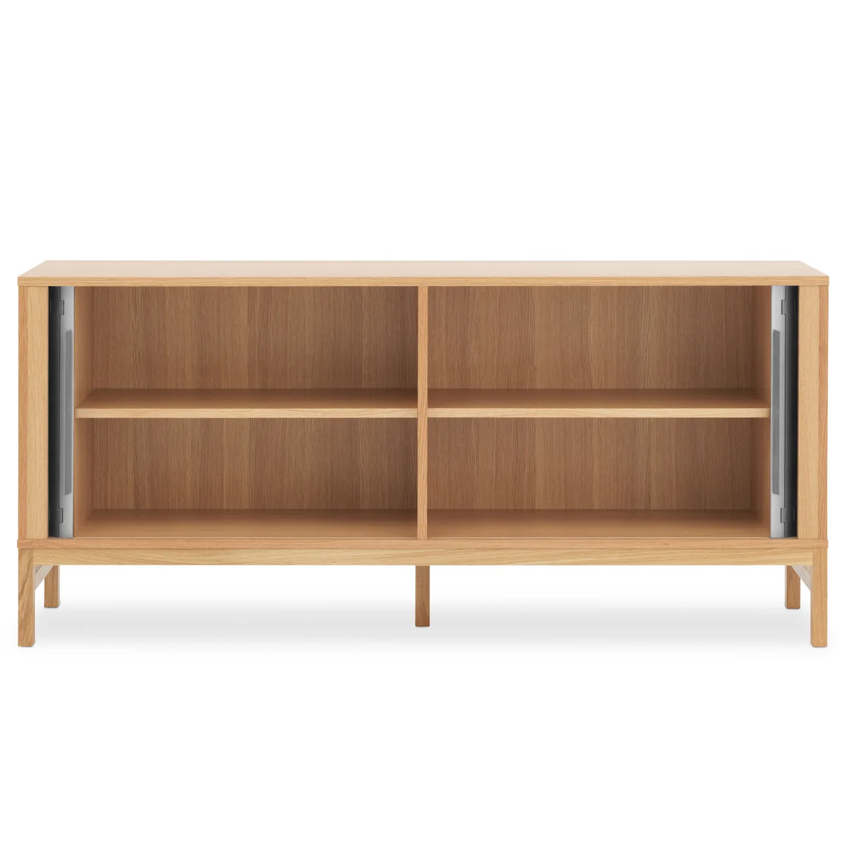 Le buffet aveugle se compose d'un corps en placage de chêne avec des pieds en chêne massif et les portes roulantes pratiques sont en plastique. La combinaison des différents matériaux et des éléments de porte donne au buffet un aspect frais et masculin. Lorsque les portes sont poussées sur le côté, le buffet s'ouvre et se présente dans sa simplicité scandinave avec un aspect bois naturel et quatre compartiments.
