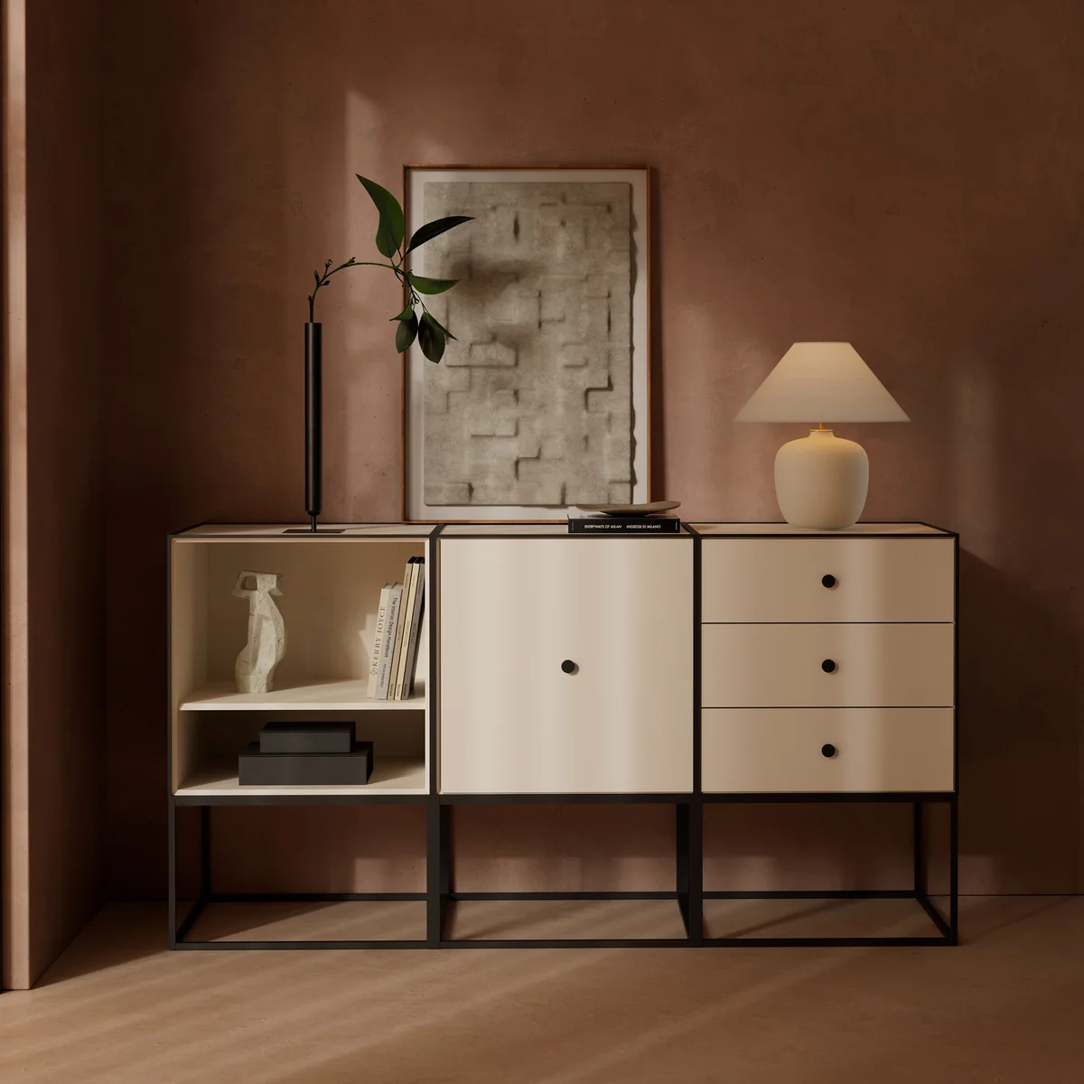 Le cadre du sideboard Frame est fabriqué en acier laqué. Le module d'étagères est en placage de chêne et en MDF. Disponible en différentes couleurs et tailles, le sideboard s'adapte parfaitement à chaque ambiance et à chaque espace.