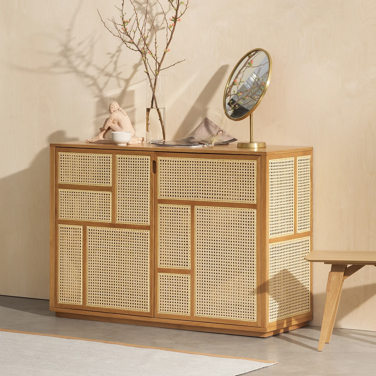 La structure du buffet est en bois de bouleau laqué et MDF. Rempli d'un filet de roseau de haute qualité. Des ouvertures d'accès pour les câbles d'alimentation sont fournies.