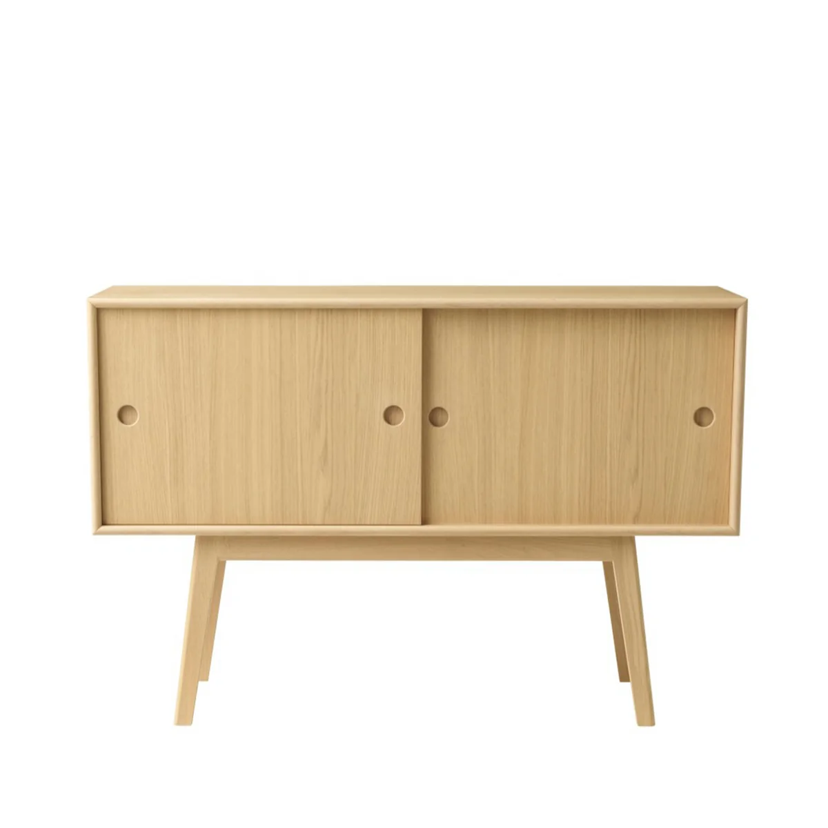 Le buffet A83 Butler fait partie de la série Butler de FDB Møbler , qui a été conçue par le duo de designers Foersom & Hiort-Lorenzen. Le design scandinave simple convainc par ses pieds en bois qui soulèvent le corps du buffet dans les airs. Selon la variante, les portes sont de couleur contrastée ou naturelle. Grâce à de petits évidements ronds, les portes coulissantes peuvent être facilement coulissées vers la gauche et la droite. Derrière, on peut ranger toutes sortes de petites choses, qui ne doivent pas être découvertes à première vue. Le buffet de la série Butler convient merveilleusement au salon ou au couloir, où il s'intègre harmonieusement à l'intérieur.