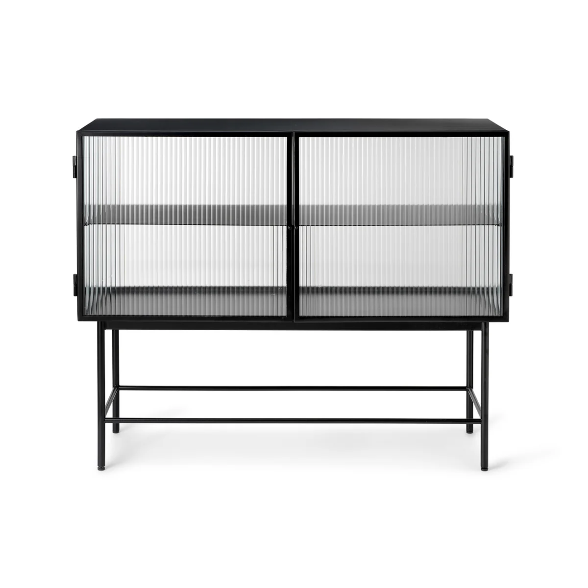 Haze Sideboard Celui de Ferm Living est une option de rangement élégante pour toutes les ambiances. Le buffet est basé sur un cadre métallique droit et filigrane. L'élément d'armoire avec deux portes en verre nervuré trône sur le dessus, créant une apparence légère et aérée. La vaisselle, les dossiers et autres objets peuvent y être pratiquement stockés. Les portes vitrées permettent une vue voilée de l'intérieur du module de l'armoire.