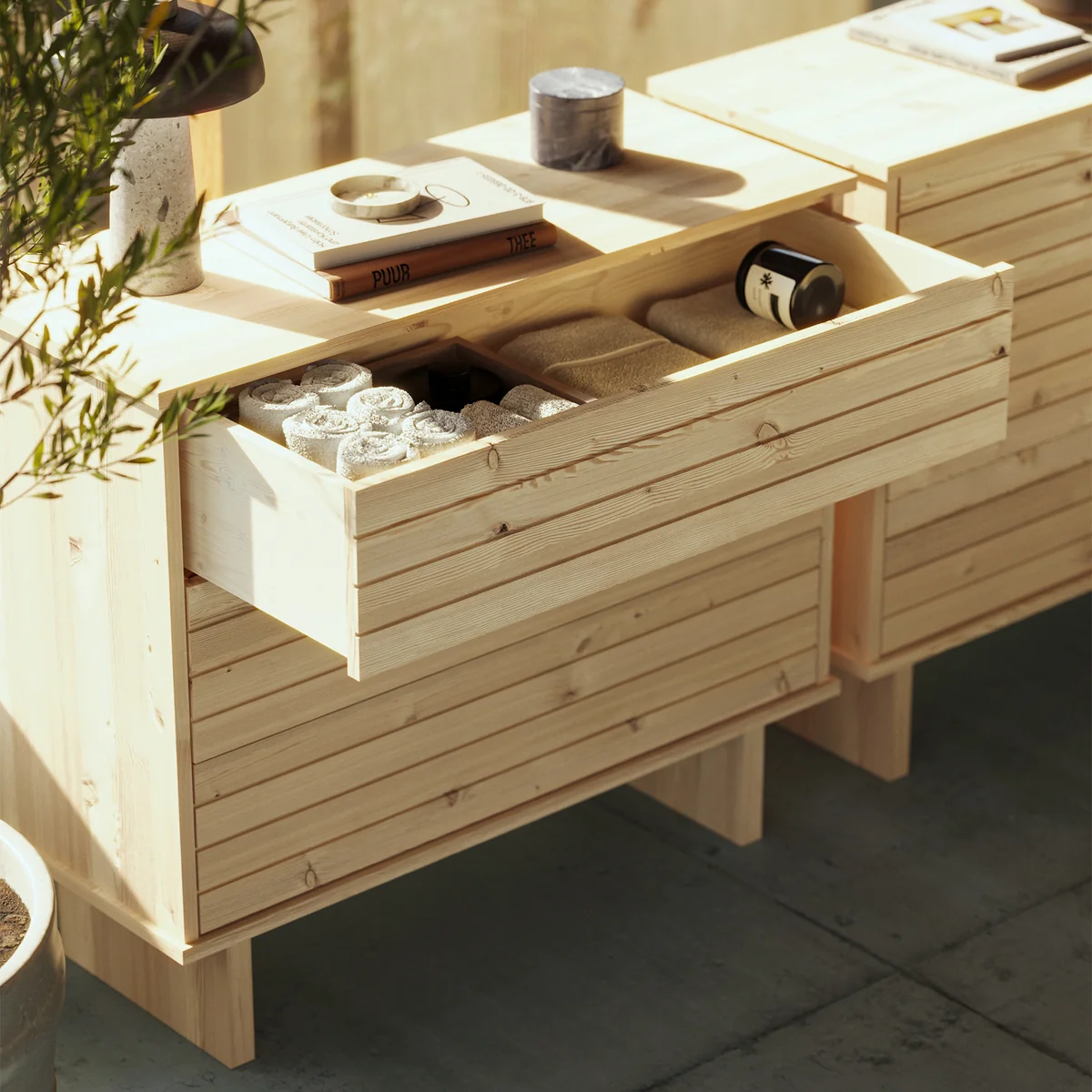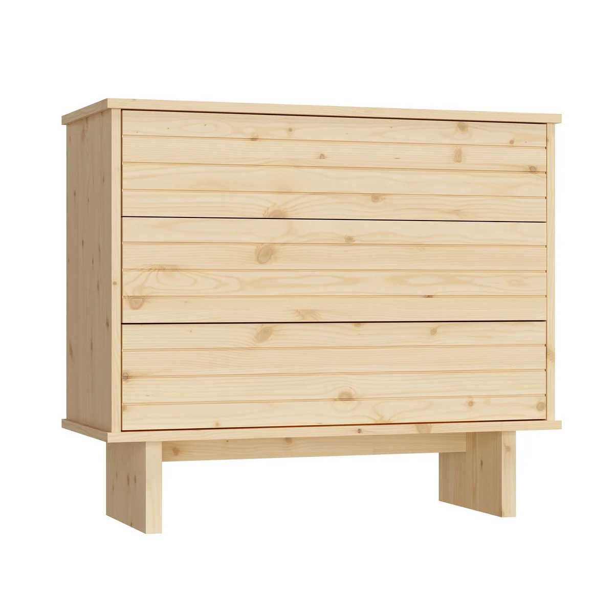 Les pieds étroits en aspect de planche rendent la Kommo Vu de face, la commode semble presque flotter. Sur le côté, la commode a plutôt l'air d'une boîte et est plus compacte. Le fraisage des tiroirs donne l'impression de lattes horizontales sans couture. Elle est fabriquée en bois de pin.