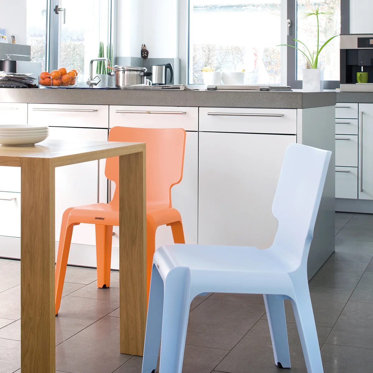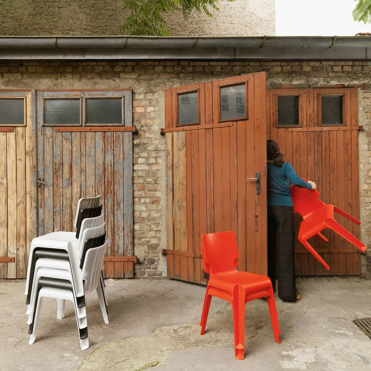 Wait est un meuble d'assise sobre et classique en matière plastique, qui renonce délibéremment à un avant-gardisme moderne. Il est empilable, facile d'entretien, robuste et tout sauf un meuble "à faire disparaitre". Sur la chaise entièrement réalisée en matière plastique, l'accent fut mis en particulier sur un haut confort d'assise. Elle est disponible en de nombreux coloris variés et peut être utilisée de manière flexible dans la maison, comme en extérieur également.