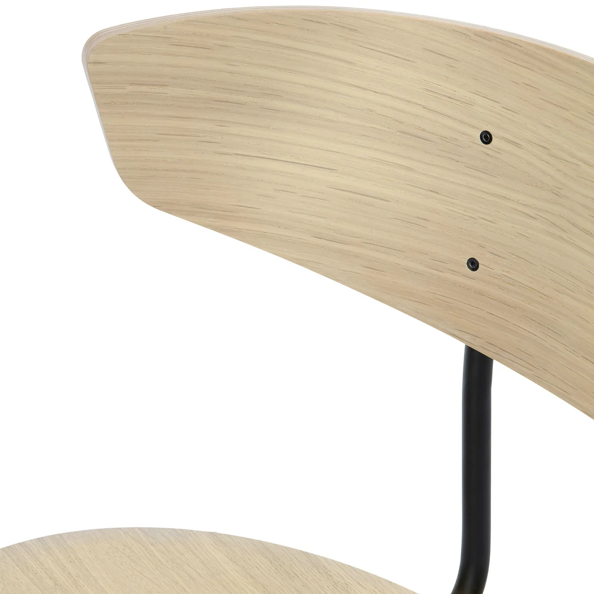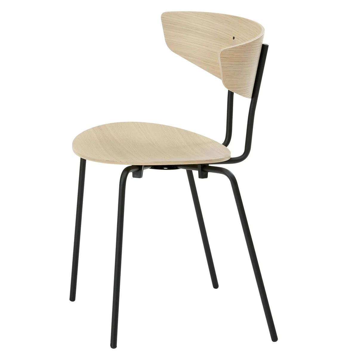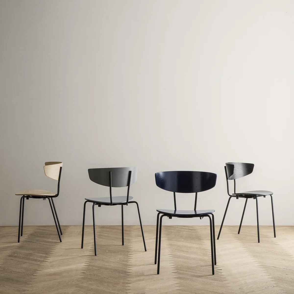 La chaise empilable de Herman Studio for Ferm Living a une structure en métal. L'assise et le dossier sont disponibles en différents bois laqués ou naturels.