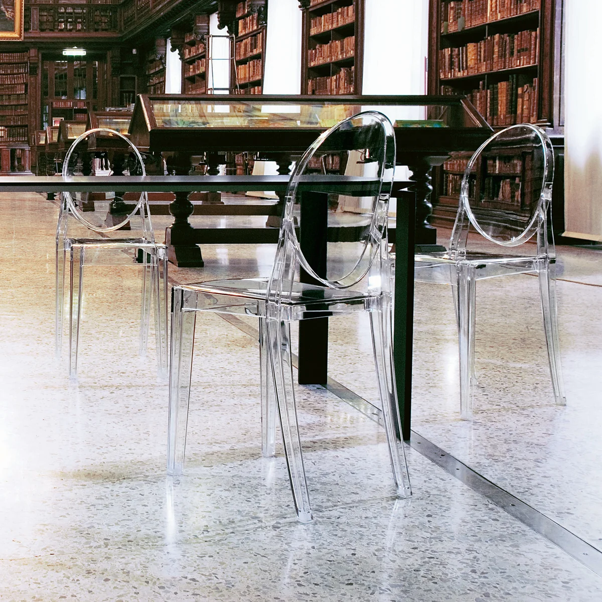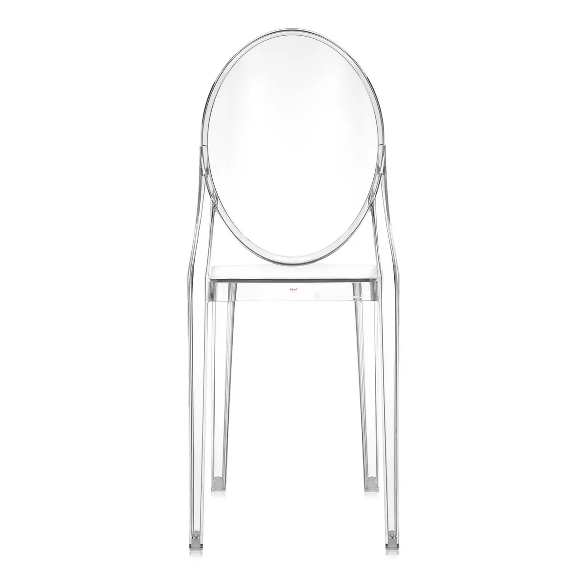 La chaise Victoria Ghost de Philippe Starck pour Kartell est une chaise de forme classique en polycarbonate - plastique transparent, ce qui fait que la chaise semble flotter de manière presque invisible - comme un fantôme.
