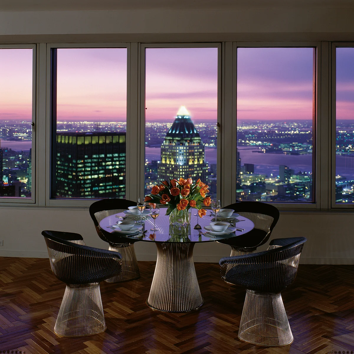 Le siège Platner est composé de centaines de fils d'acier recouverts de nickel et soudés entre eux. Le cadre en acier sert à la fois de structure et d'élément décoratif. Knoll fabrique la coque d'assise en fibre de verre avec des coussins en mousse froide. Le dessous de la chaise est doté d'une Platner La partie inférieure de la chaise avec accoudoirs est munie d'un anneau en plastique transparent qui protège le sol et la chaise des dommages.