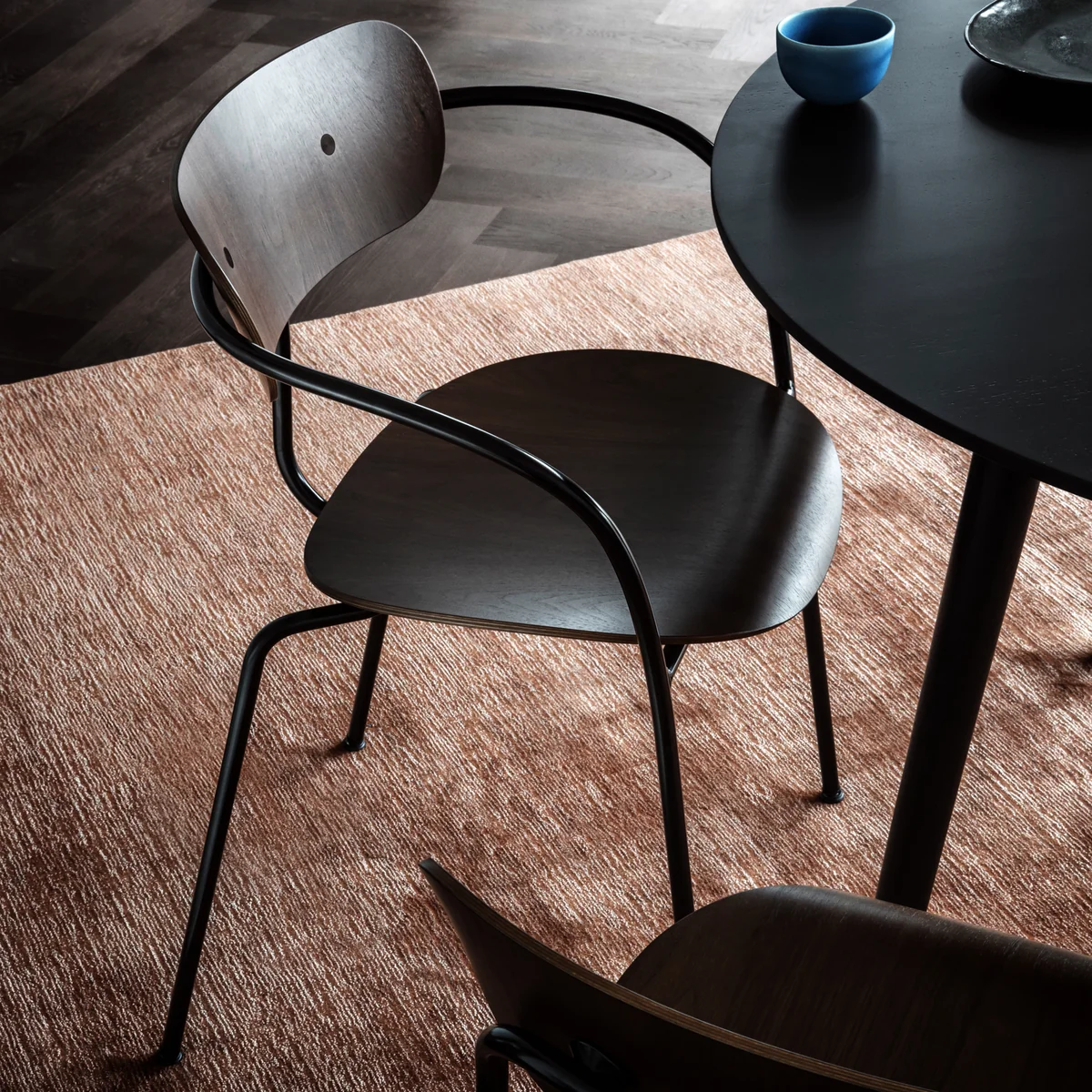 Sous tous ses angles, la chaise avec accoudoirs Pavilion par Anderssen & Voll pour & Tradition, a une silhouette légère, gracieuse et lyrique. La chaise est constituée de tube d’acier replié et contreplaqué moulé. La structure, assise et dossier sont alignés optiquement et créent une chaise intemporelle et élégante s’intégrant facilement dans tous types de milieux. Intéressant est son aspect tendre, accentué par les courbes douces, généreuses et les tubes en acier filigranes du cadre. Le siège a très belle allure comme chaise de salle à manger, de cuisine, de bureau ou dans la chambre, mais aussi dans des cafés modernes et élégants hôtels.