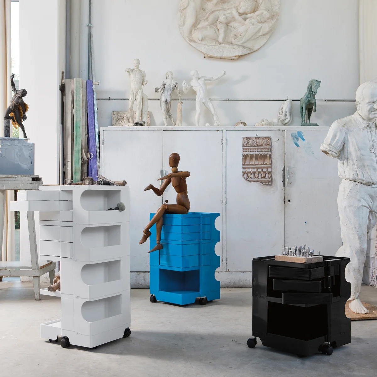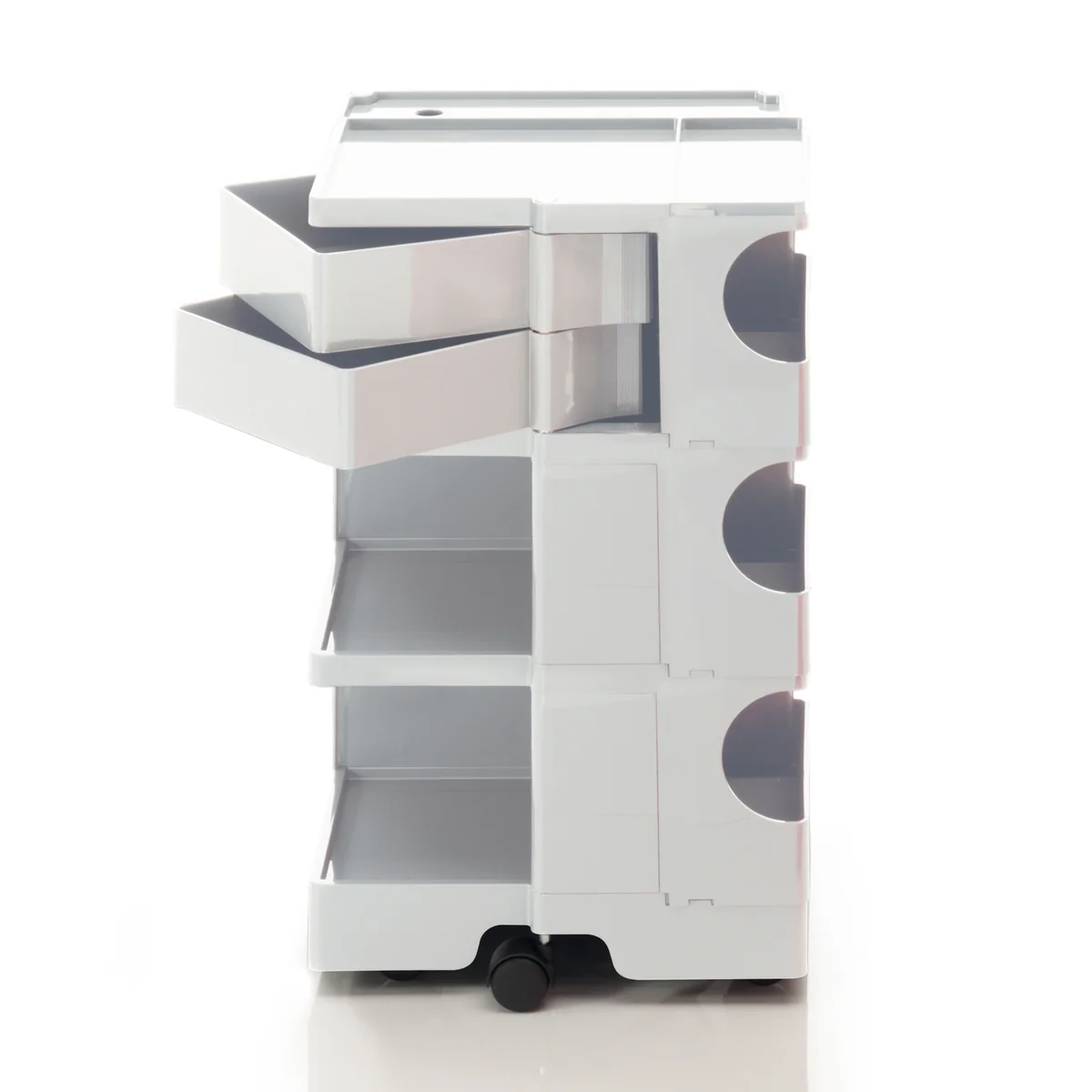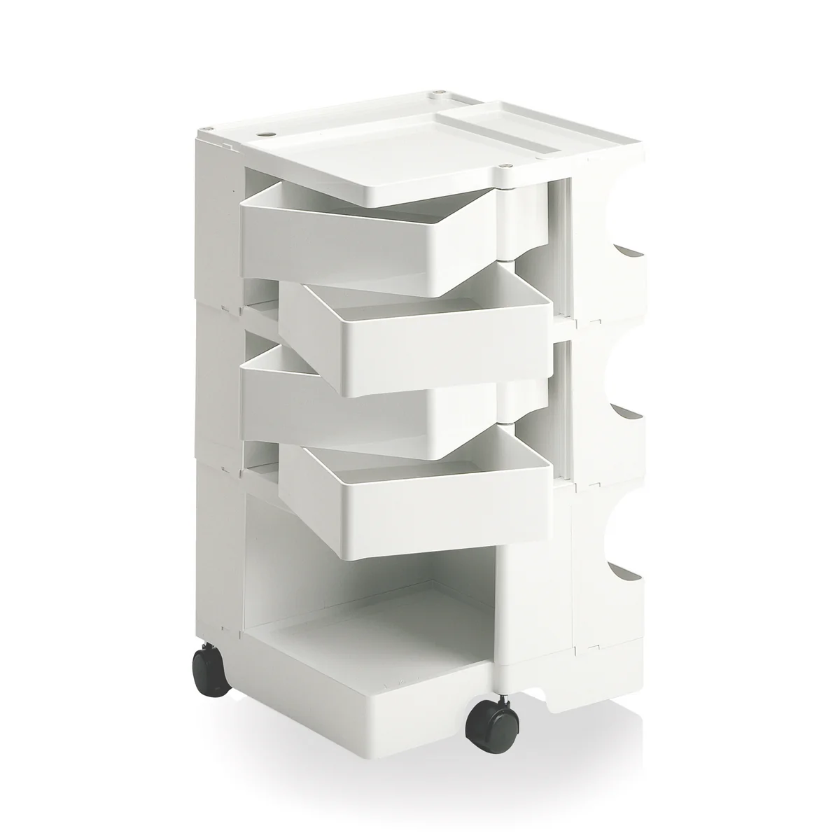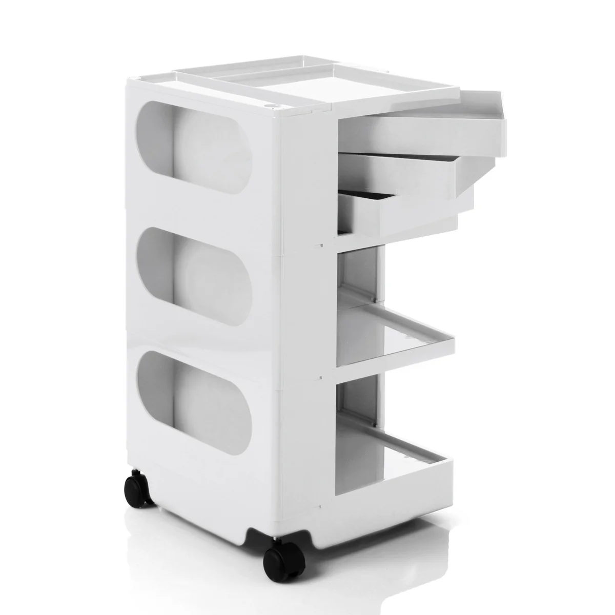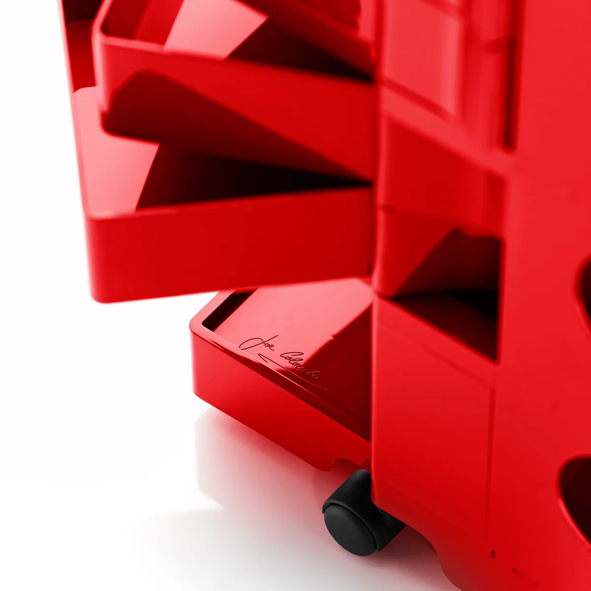 Le conteneur à roulettes de Joe Collombo est en plastique ABS moulé par injection et facile à nettoyer. Il peut être utilisé aussi bien dans une cave de loisirs que dans un atelier professionnel, dans un salon de coiffure, dans un magasin ou dans une salle de bains.