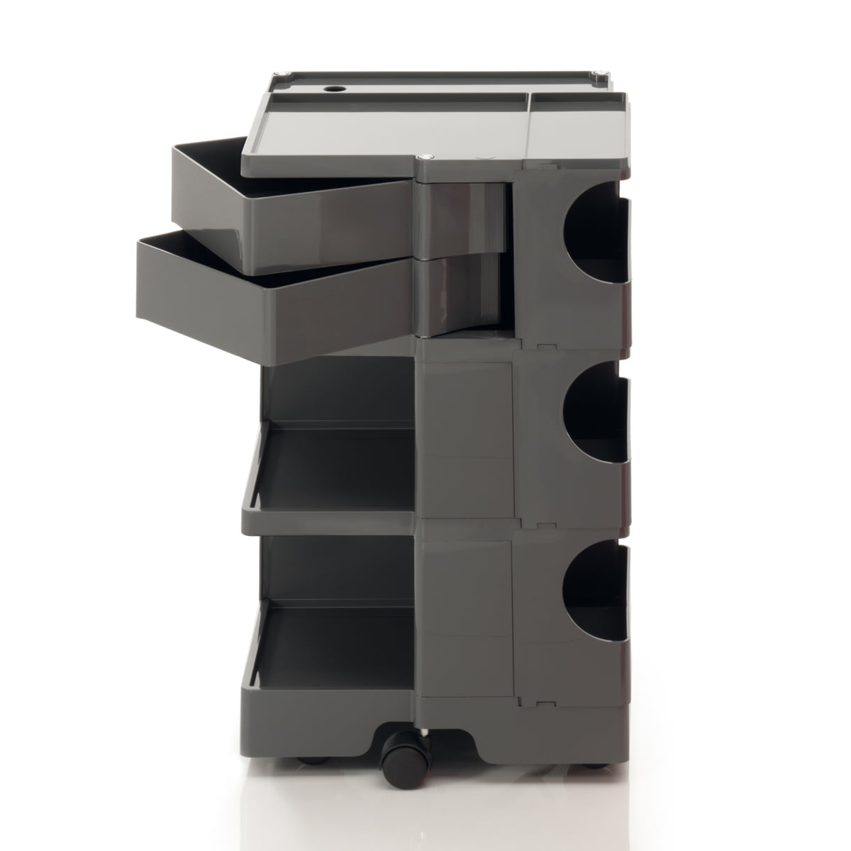 Le conteneur à roulettes de Joe Collombo est en plastique ABS moulé par injection et facile à nettoyer. Il peut être utilisé aussi bien dans une cave de loisirs que dans un atelier professionnel, dans un salon de coiffure, dans un magasin ou dans une salle de bains.