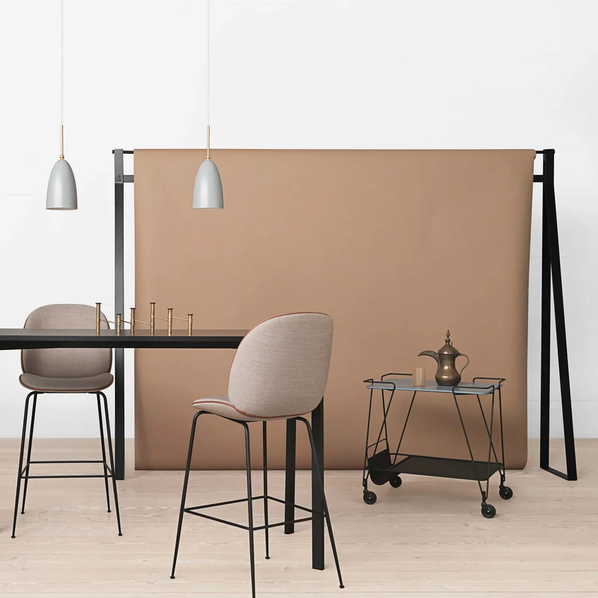 Le chariot Matégot de Gubi, conçu en 1953 et 1954 par le designer Mathieu Matégot, est une desserte pratique en métal perforé avec des barres en métal. La tôle est courbée avec la technique spéciale Rigitulle.