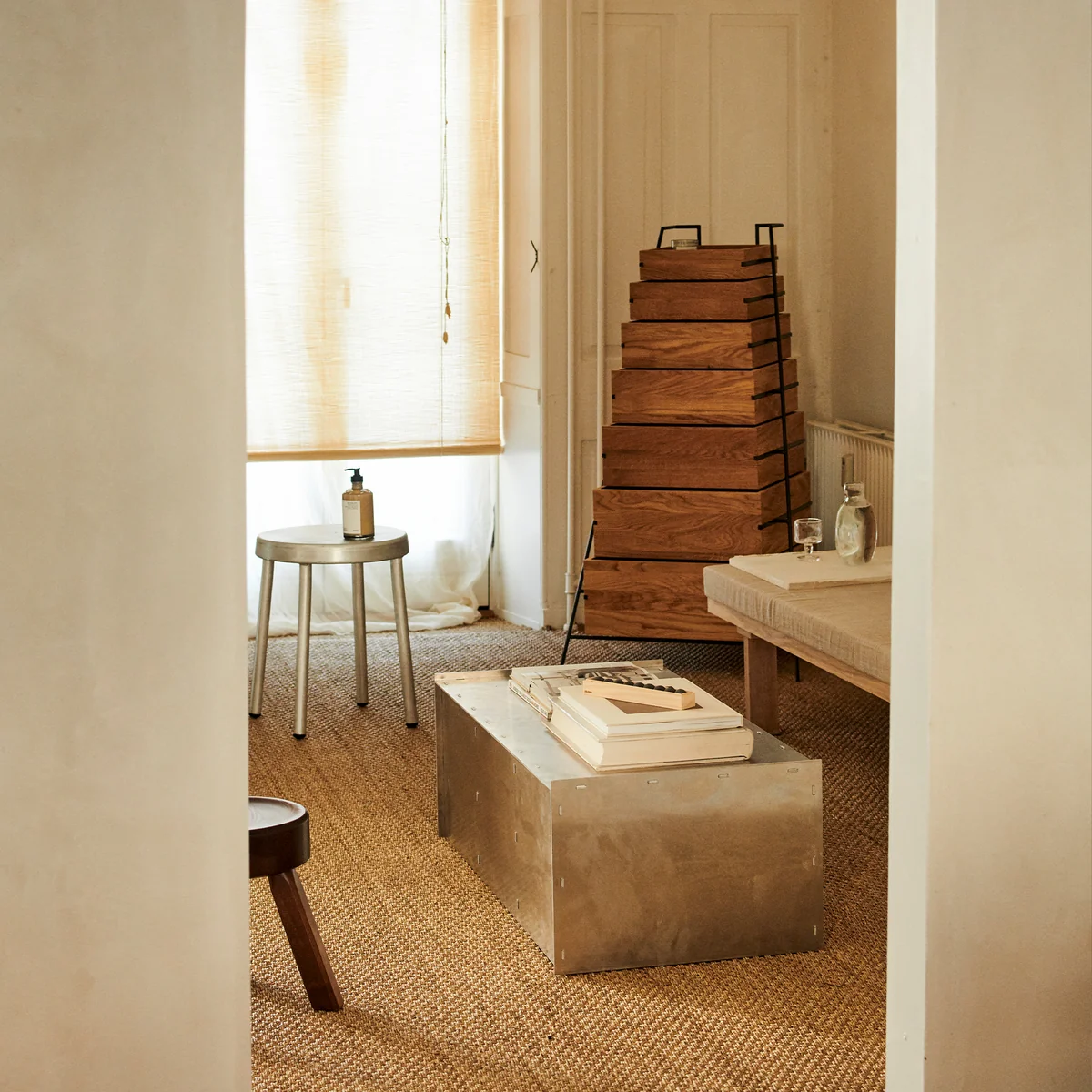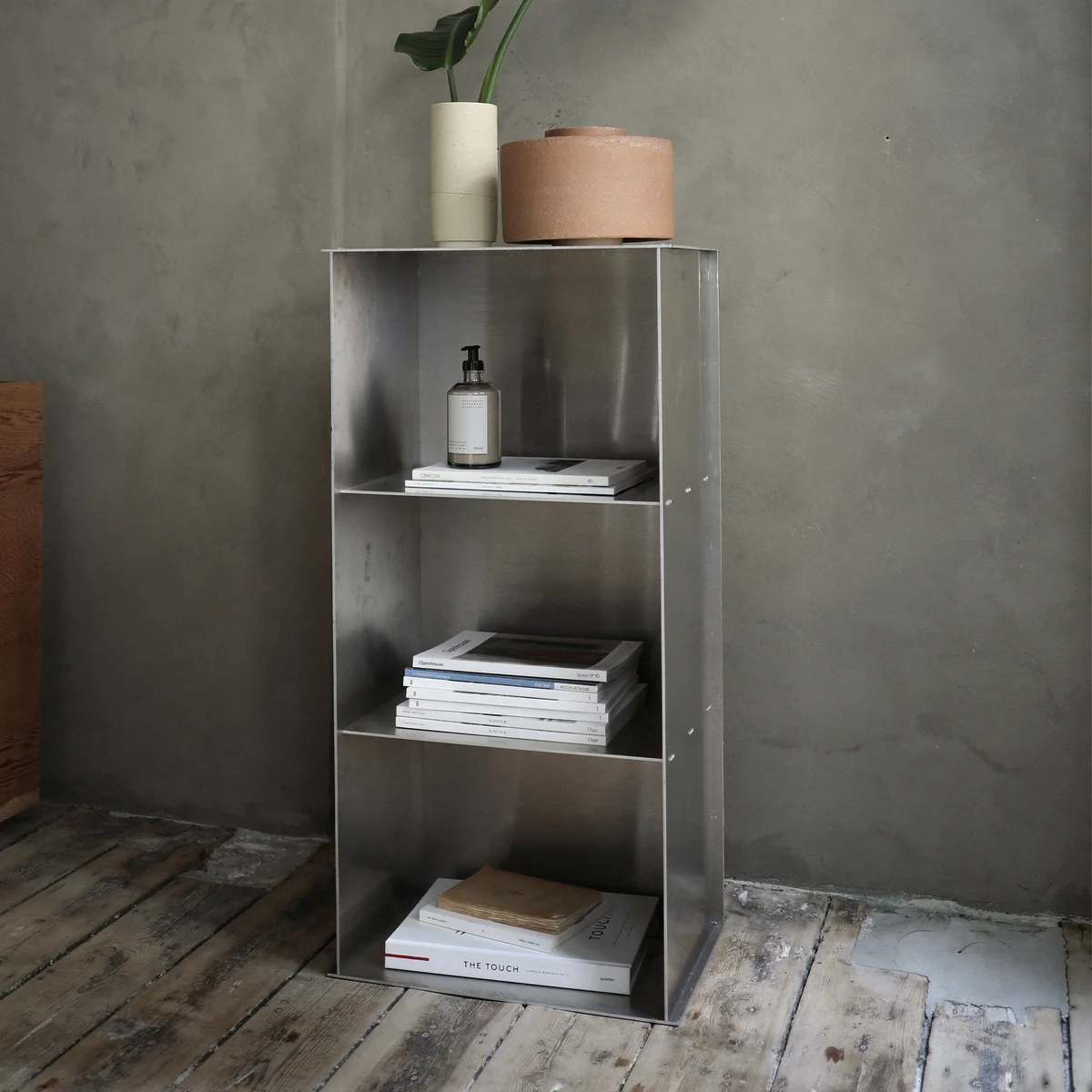 Le site Rivet Case de Frama offre la possibilité d'expérimenter différentes variations de montage visuel. Son design rectiligne est découpé au laser et martelé à la main, ce qui lui permet de trouver le parfait équilibre entre artisanat et production industrielle. Développé à l'aide d'une technique pratique de rivetage et de tenon, le maximum de propriétés est tiré de l'aluminium. L'aluminium non traité présente un aspect industriel et esthétique qui confère à l'espace une note qui vaut la peine d'être vue. Le design est né de la plume de Jonas Trampedach en 201. 4.