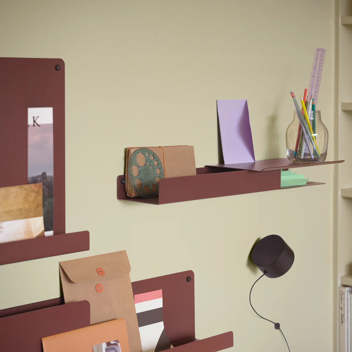 Le Folded Shelf est composé d'une seule pièce de métal et est disponible en trois tailles différentes ainsi que dans d'autres couleurs.
