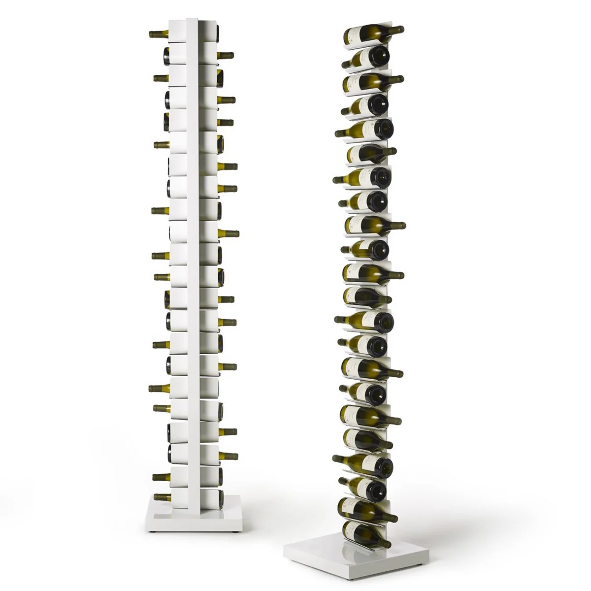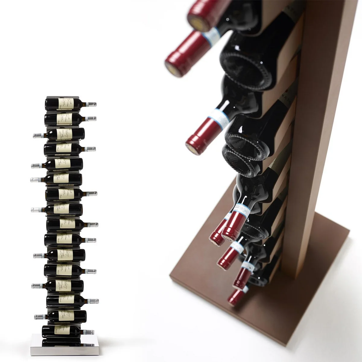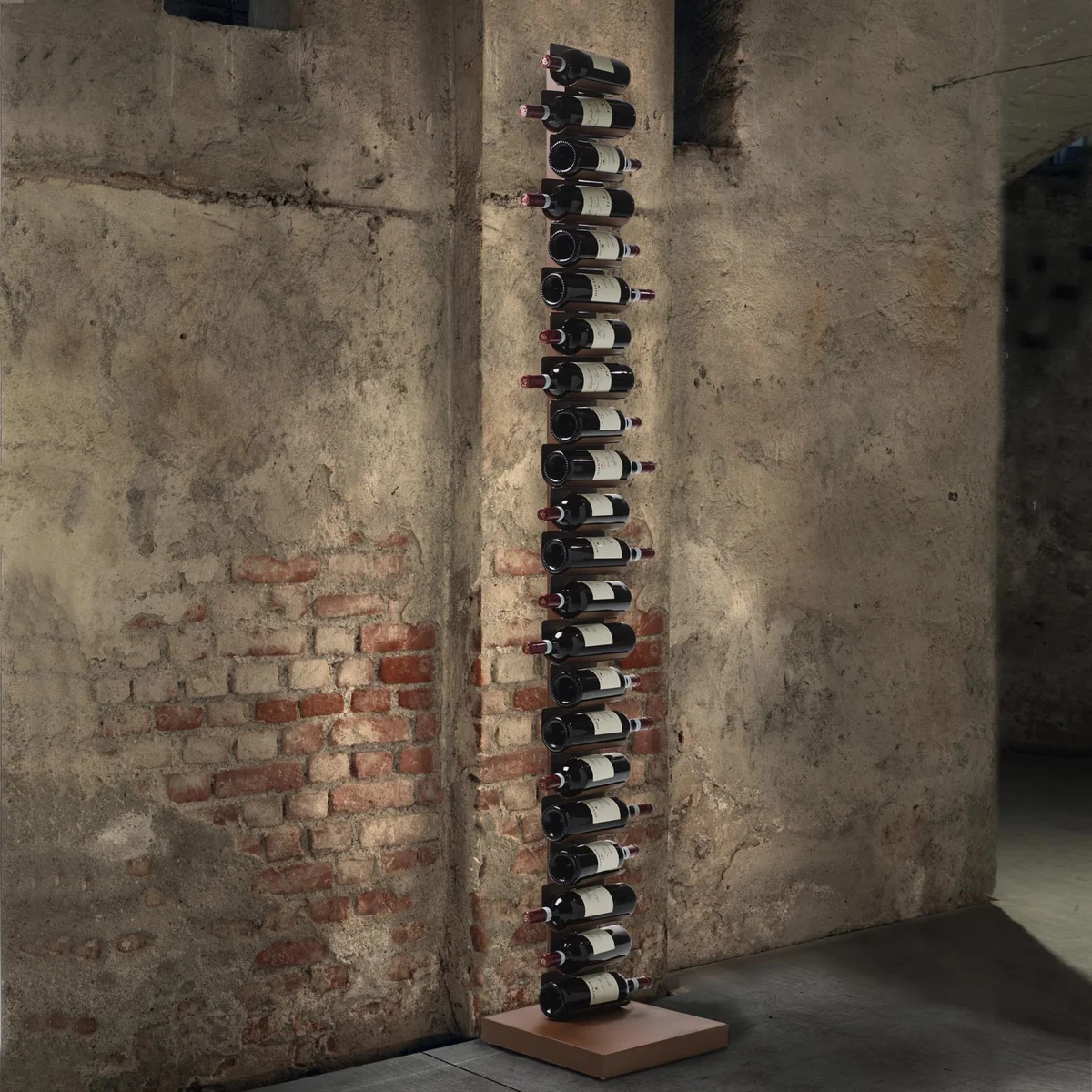 La base du rayonnage est une colonne métallique reliée à un système de lattes. Les supports sont conçus pour être aussi discrets que possible afin de donner au spectateur l'idée de bouteilles suspendues. Mince, noble et extravagant, tel est le design de ce porte-bouteilles de vin, qui s'intègre aussi bien dans le salon de la maison que dans les bars ou les halls d'hôtel. Indépendante, l'étagère peut être disposée à n'importe quel endroit de la pièce.