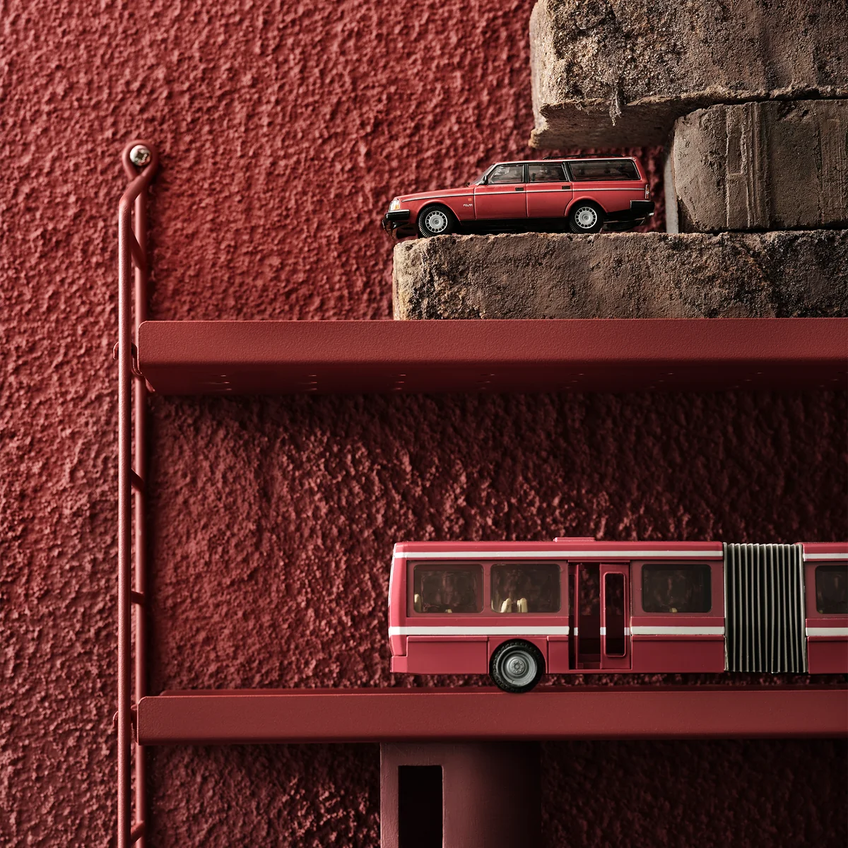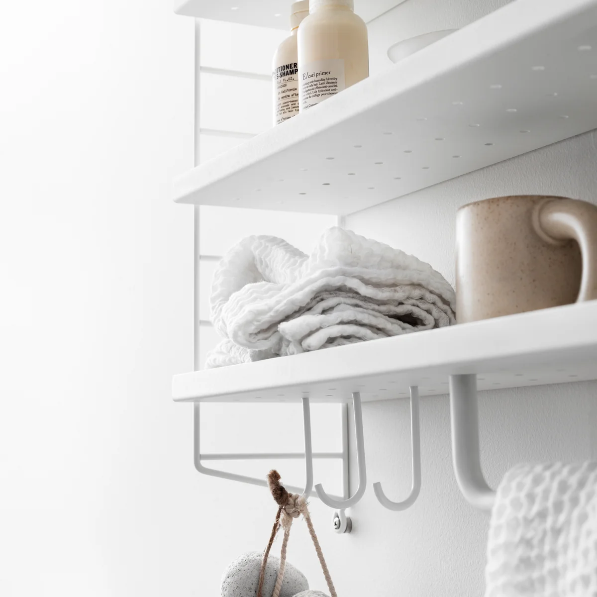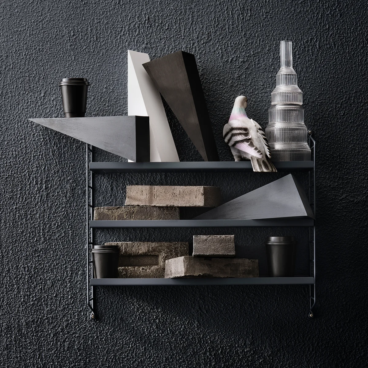 Le système String Pocket peut être combinée avec d'autres étagères et étendue aussi bien vers le haut que vers le côté. Les échelles de sol ne sont pas disponibles pour cette étagère. La livraison comprend deux éléments latéraux pour le montage mural et trois étagères assorties.