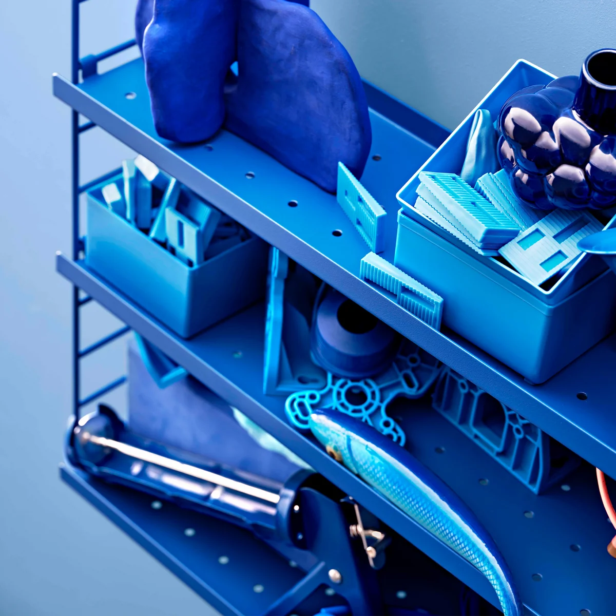 L'étagère String Pocket est désormais également disponible en métal, dans des couleurs discrètes et intemporelles ainsi que dans des couleurs néon voyantes. Entièrement en métal et dotée d'étagères perforées très pratiques, cette étagère compacte en métal peut non seulement être suspendue dans la chambre d'enfant ou le salon, mais aussi être utilisée dans la cuisine ou la salle de bain.