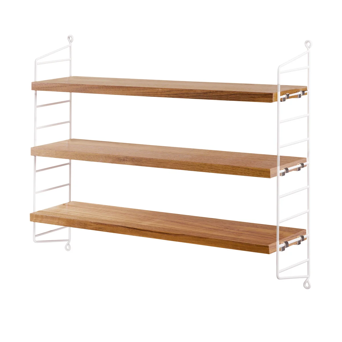 Le String Pocket Nisse Strinning se combine avec d'autres étagères et peut être agrandie aussi bien vers le haut que sur le côté. Les échelles de sol ne sont pas disponibles pour cette étagère. La livraison comprend deux éléments latéraux pour le montage mural et trois étagères assorties.