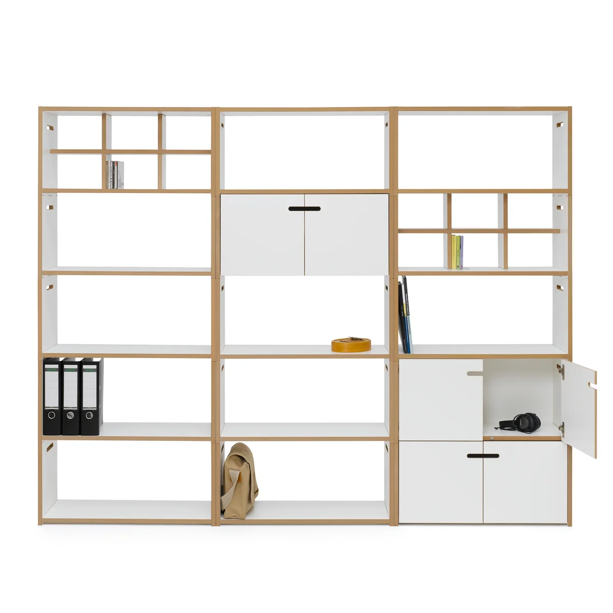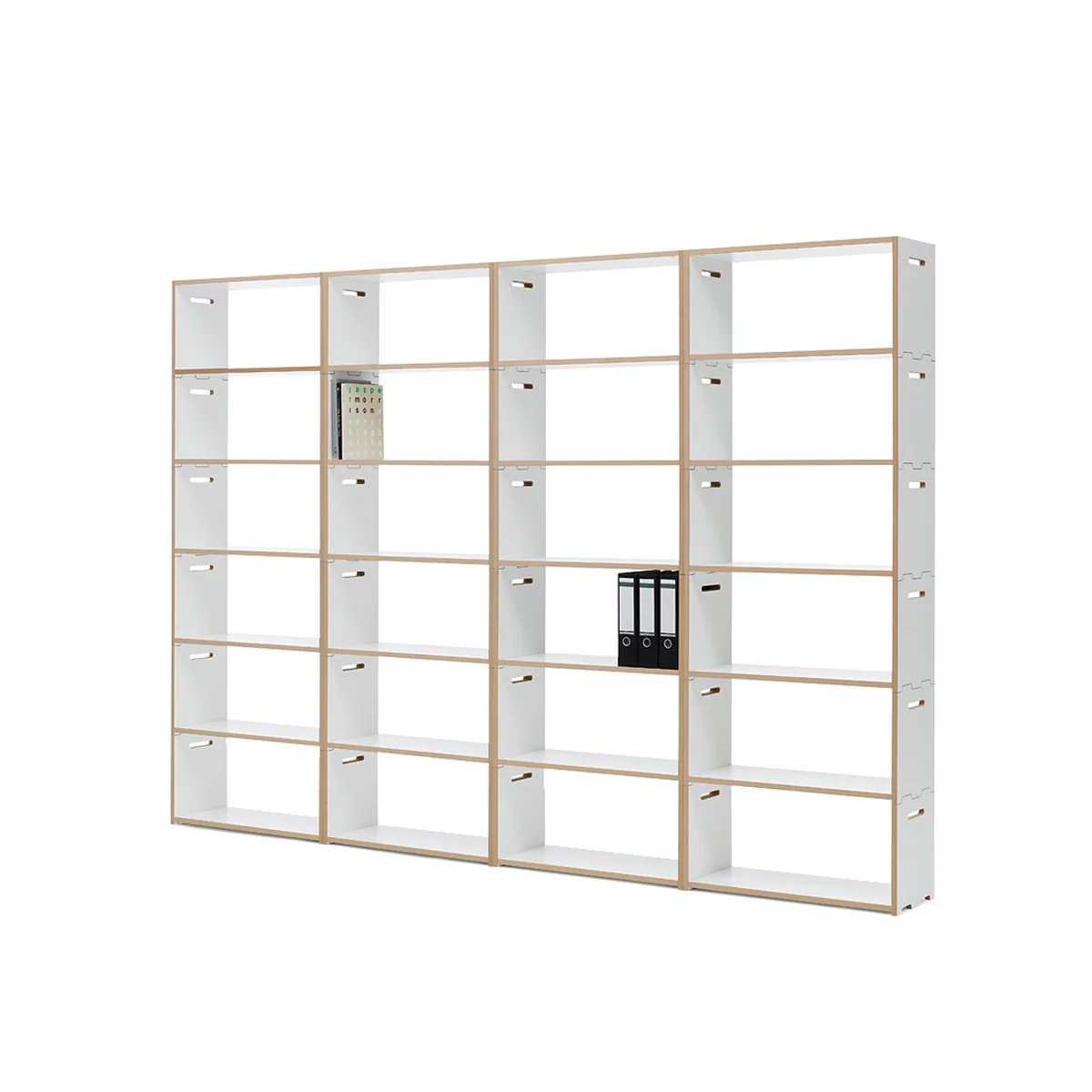 Les panneaux latéraux fraisés distinctifs donnent à l'unité d'étagère Hochstapler Les profilés latéraux fraisés distinctifs donnent au rayonnage de Tojo son aspect unique, mais ils servent surtout à relier les segments entre eux. En fixant la base légèrement en dessous de la section fraisée, on évite tout glissement latéral.